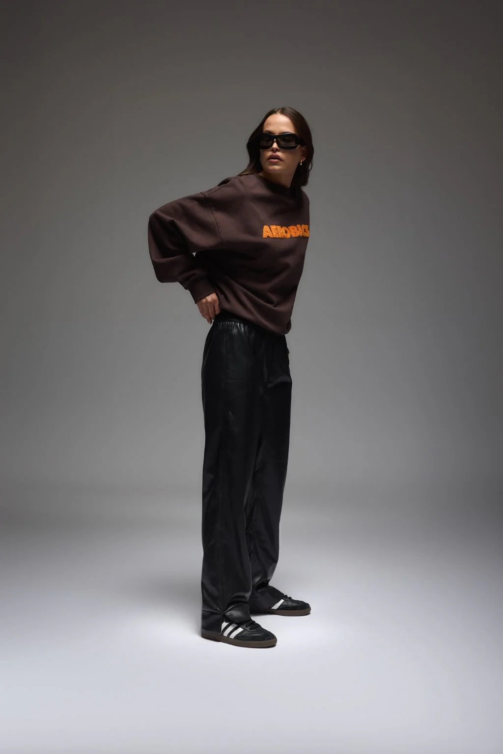 Our Aerobics Sweatshirt in Espresso is cut in a beautiful cotton brushed fleece. Featuring our exclusively designed shearling applique on the front in a contrasting orange hue. Our Aerobics Sweatshirt is effortlessly cool and pairs perfectly with our Jada Vegan Leather Pant in Noir.