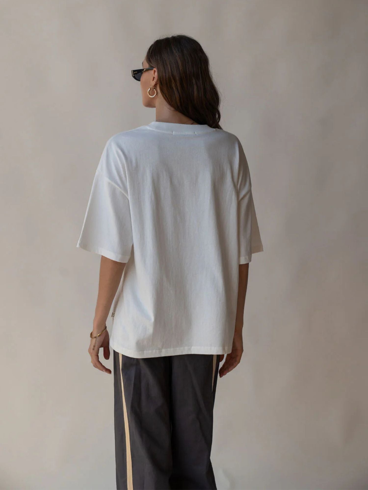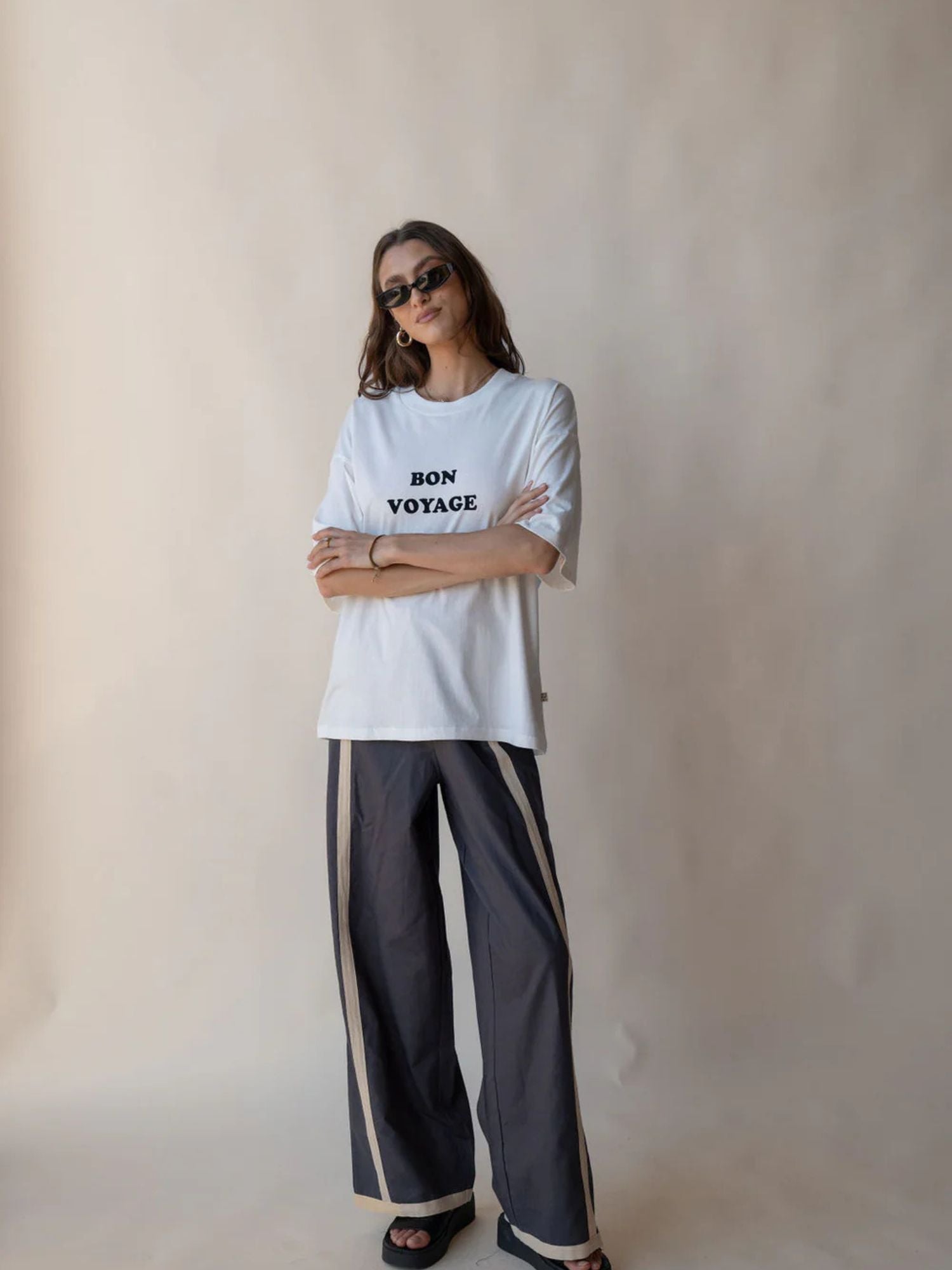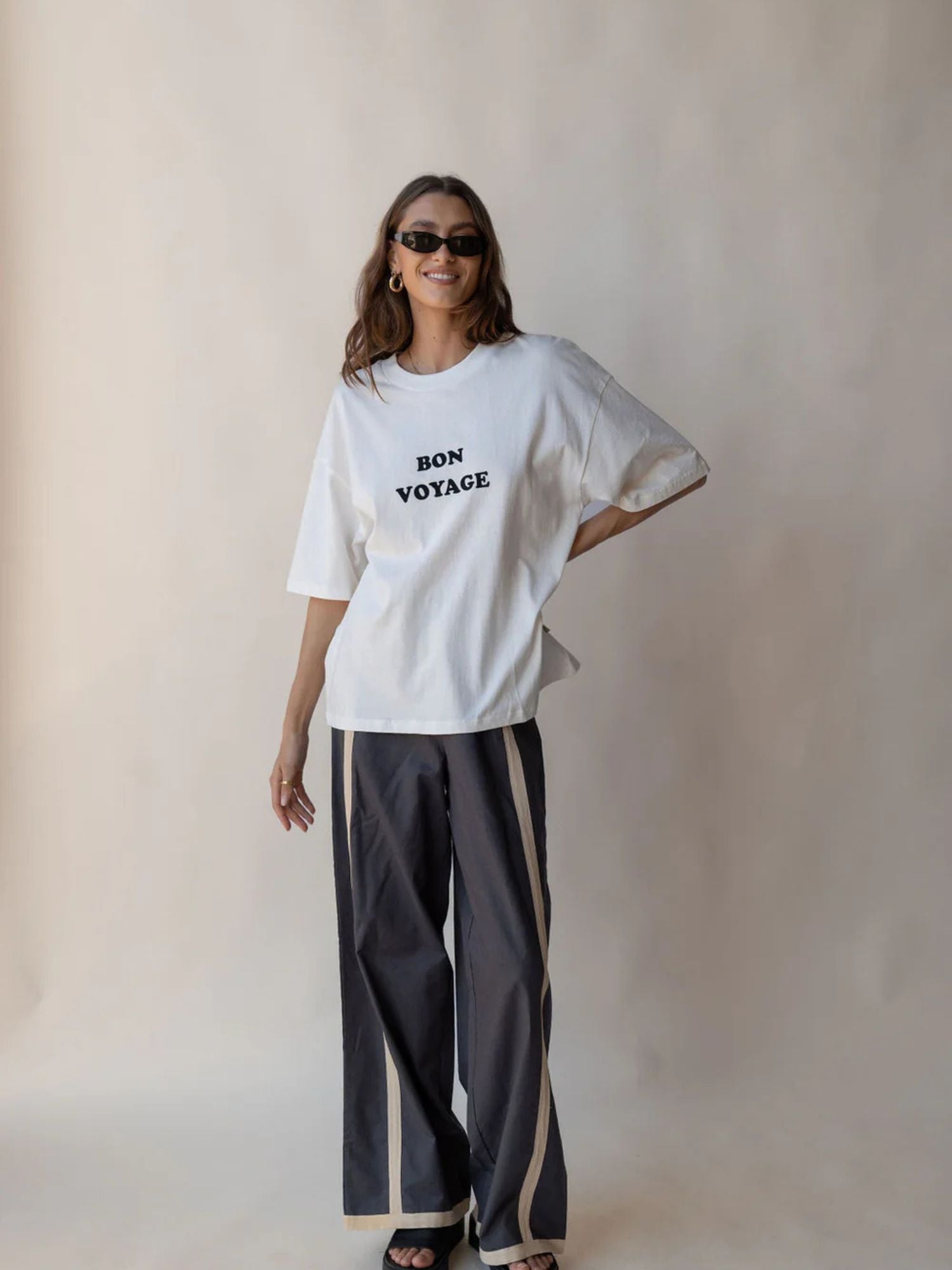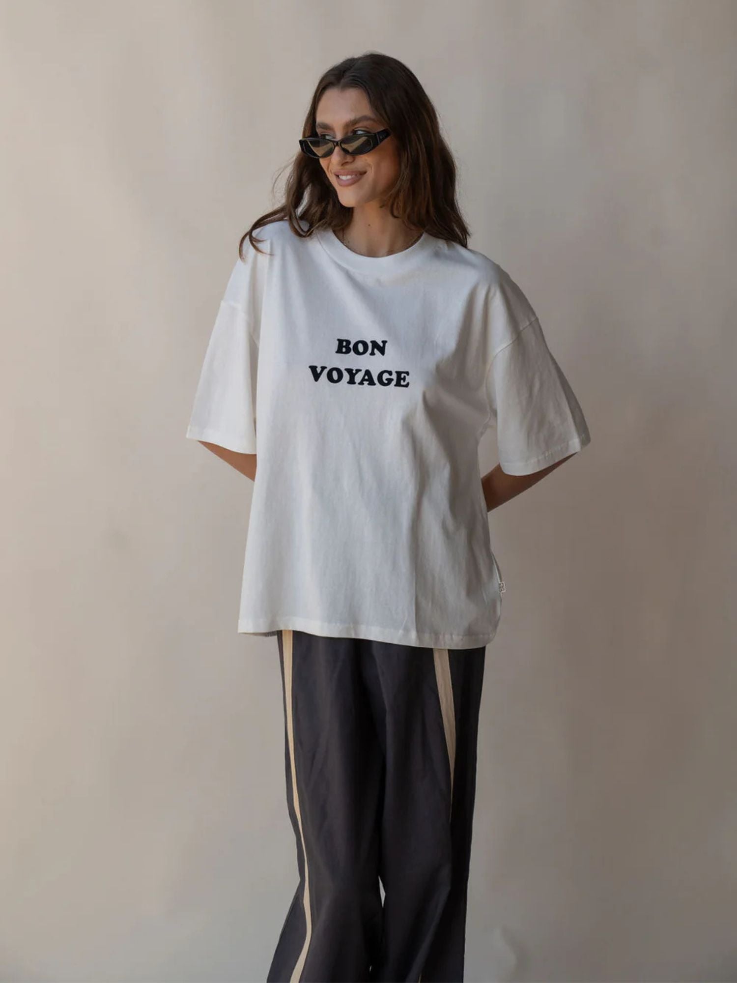 The Bon Voyage Tee in Snow is your new chic staple piece. Cut in our classic oversized, boxy silhouette with "Bon Voyage" at the front in textural velvet. This classic crew neck shape is the perfect holiday tee and pairs perfectly with the Del Mar Pant in Charcoal.