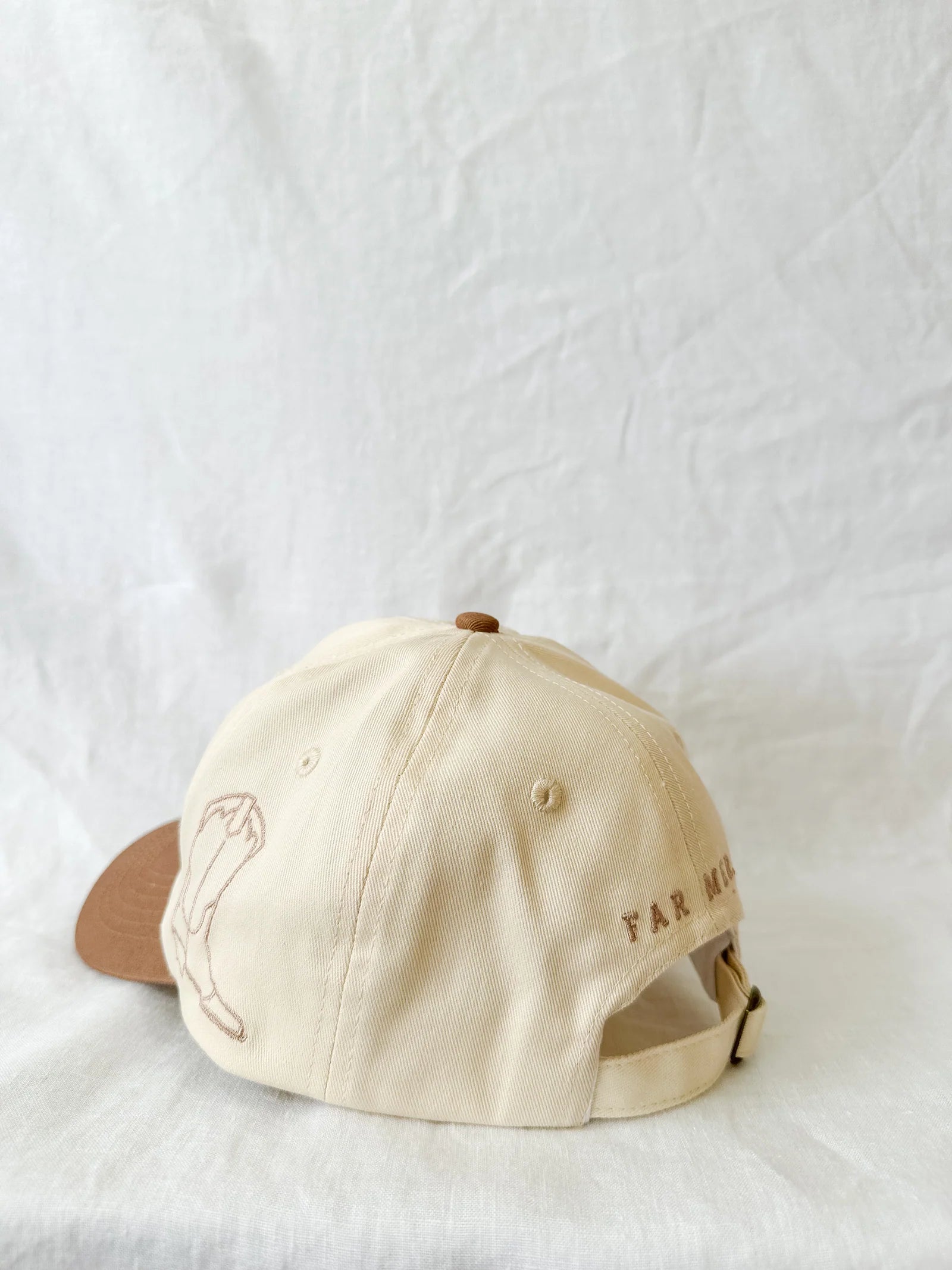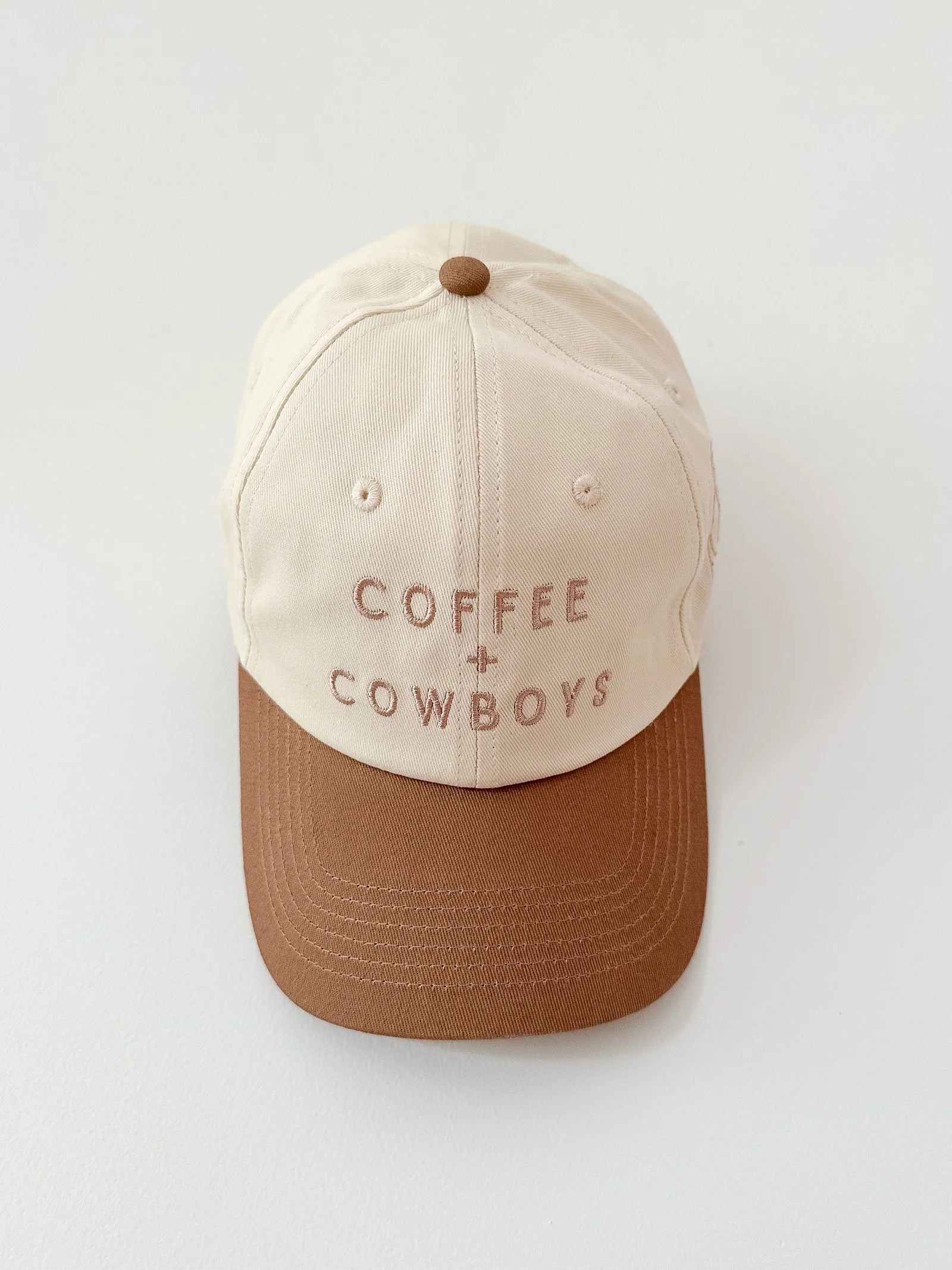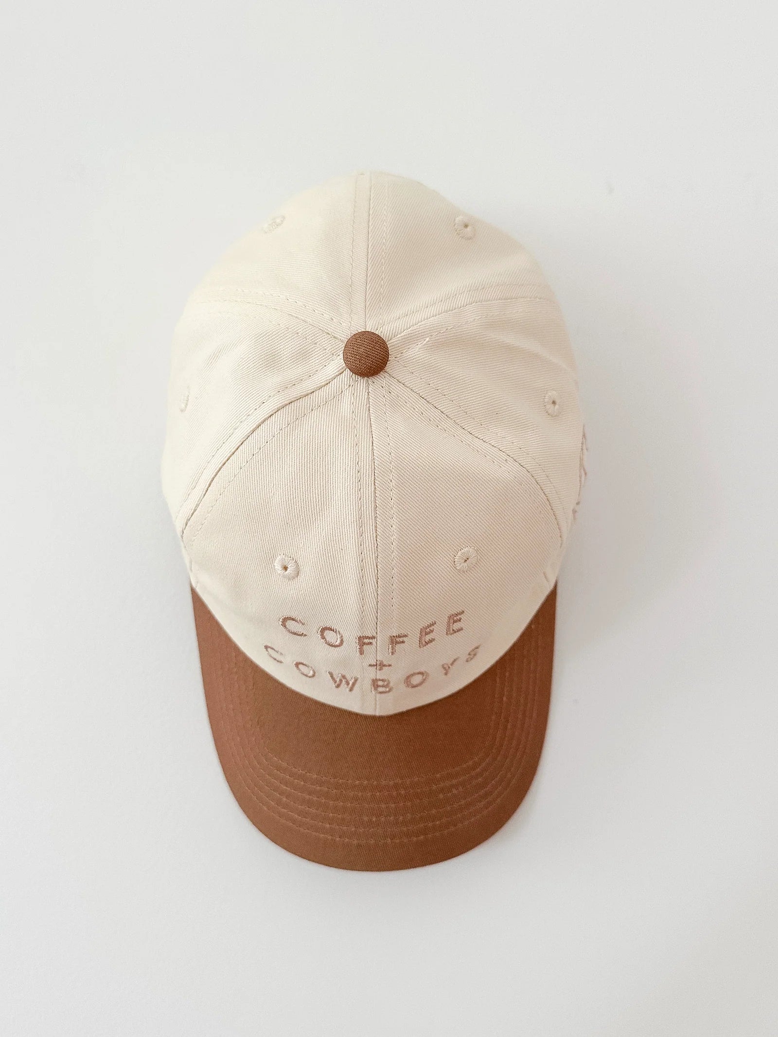 Embroidered COFFEE + COWBOYS logo on natural coloured background with adjustable metal buckle, relaxed & unstructured fit.