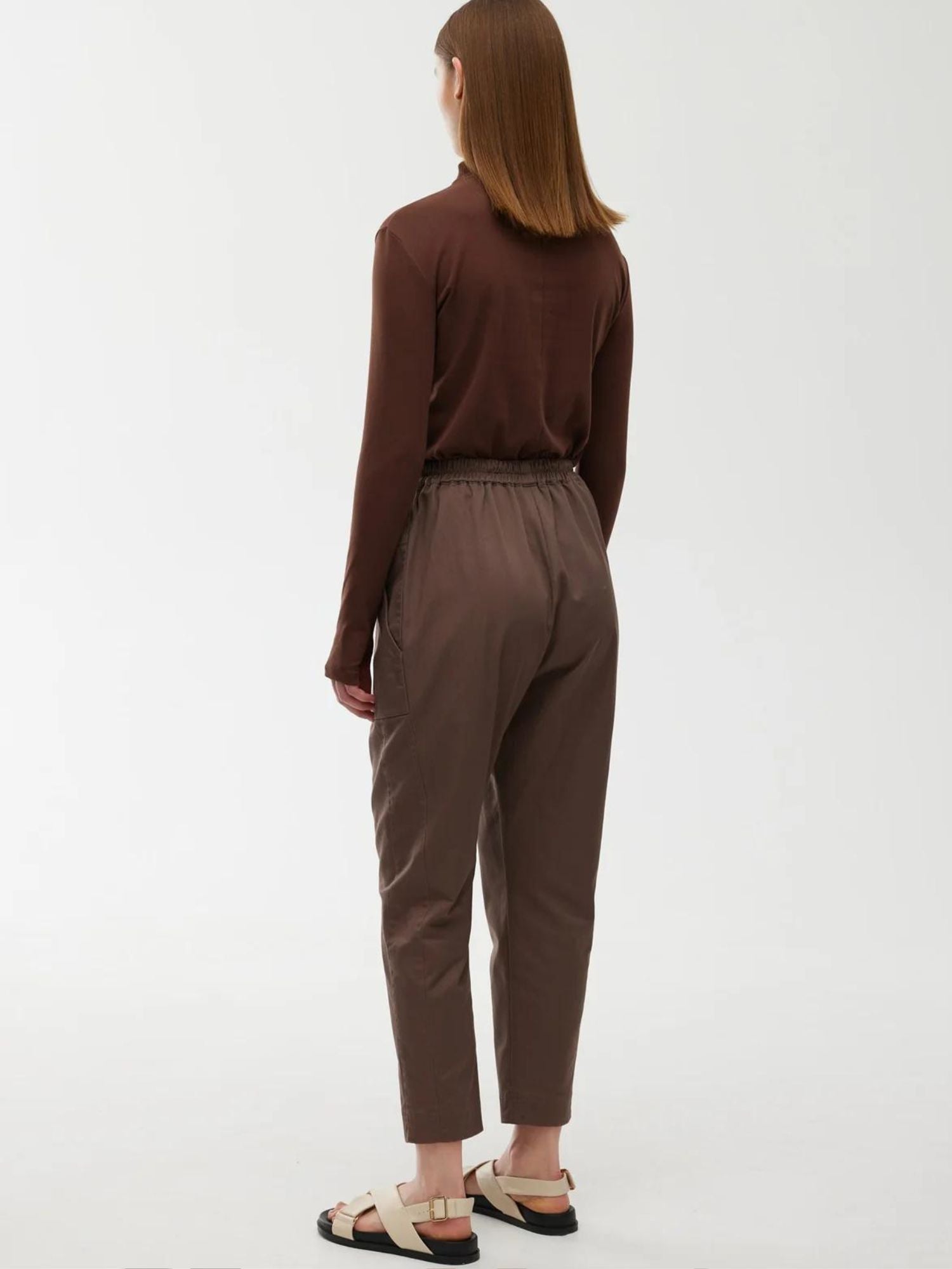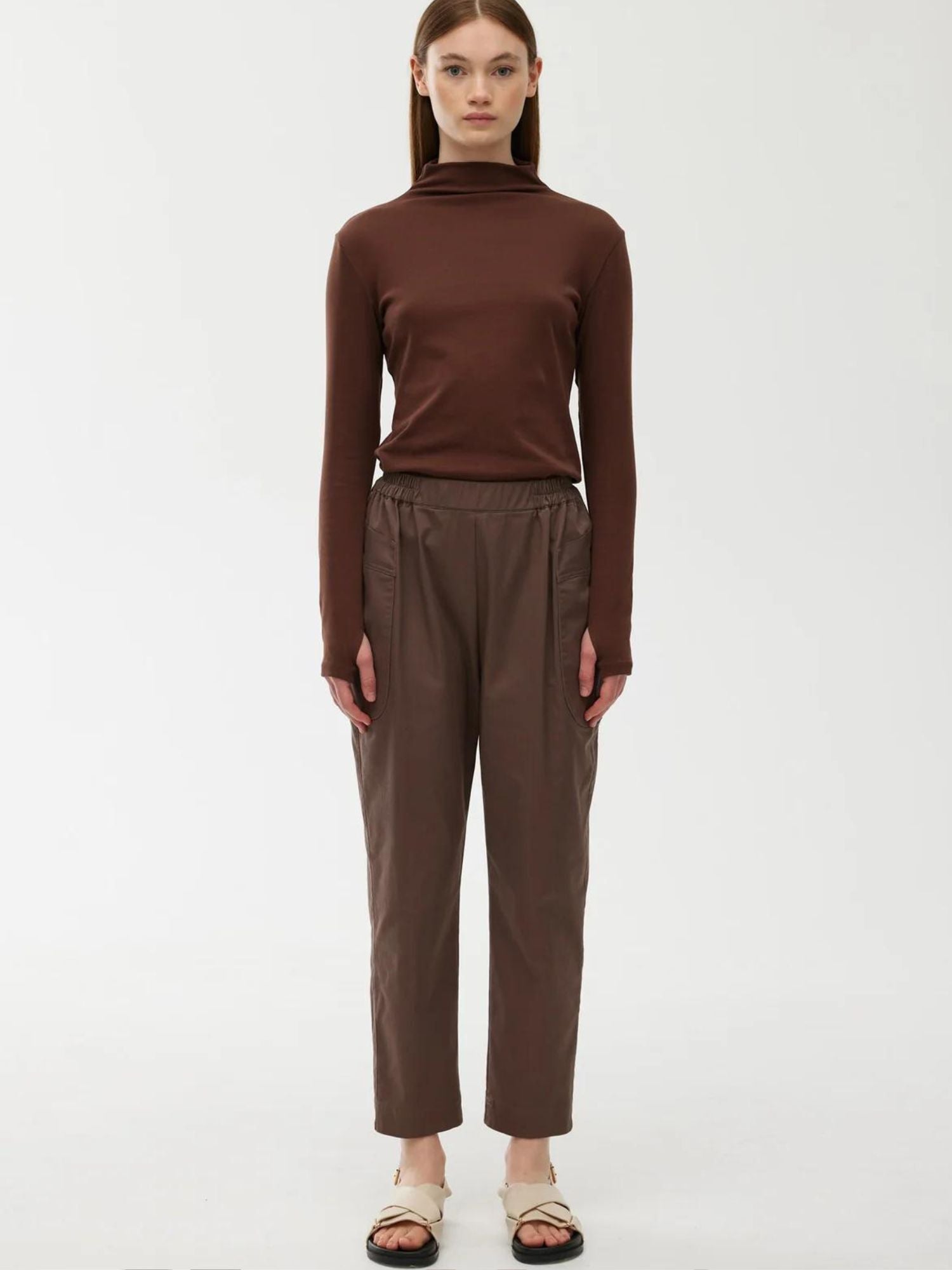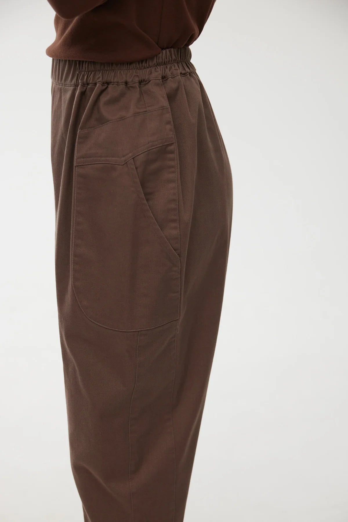 The Cooper Pant in Chocolate exudes effortless everyday dressing and endless versatility to carry you from season to season. Detailed with a rounded tapered silhouette and artful volume throughout the leg, this pant features an elasticated waist and exaggerated pockets.