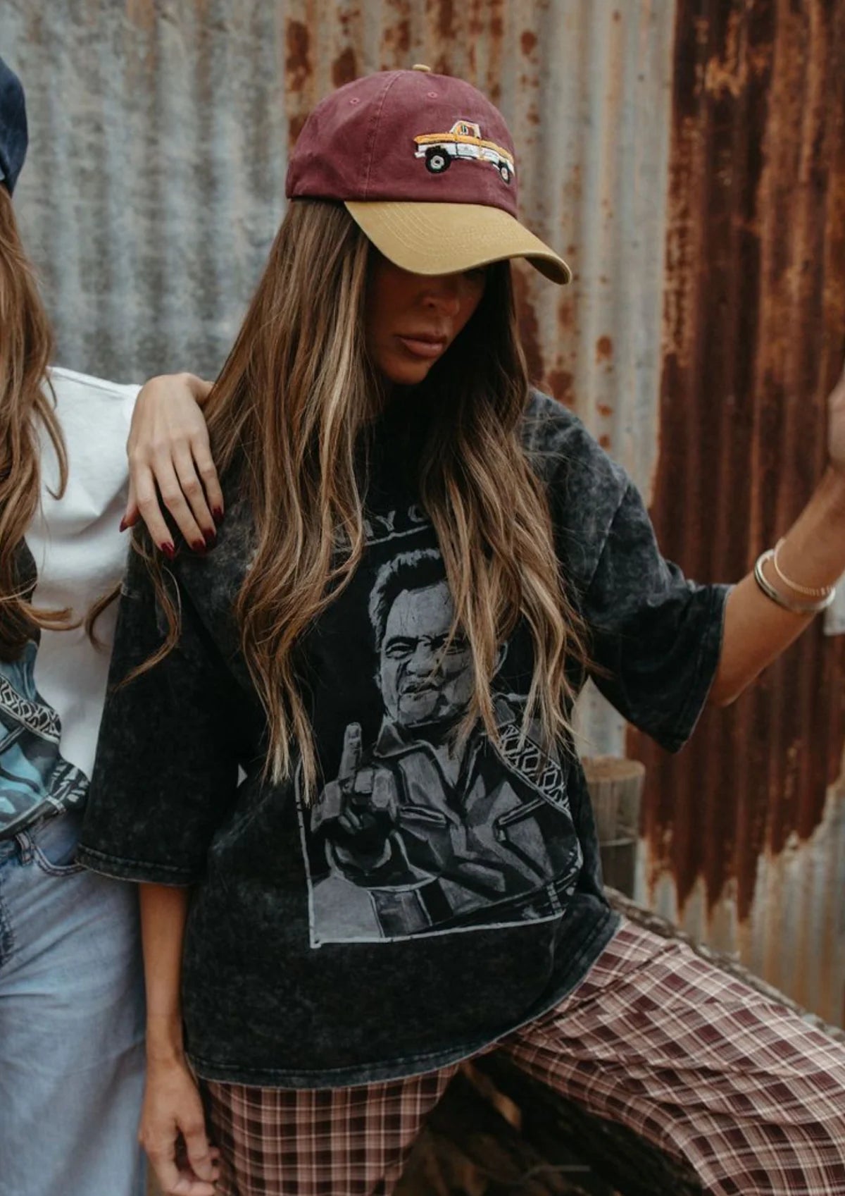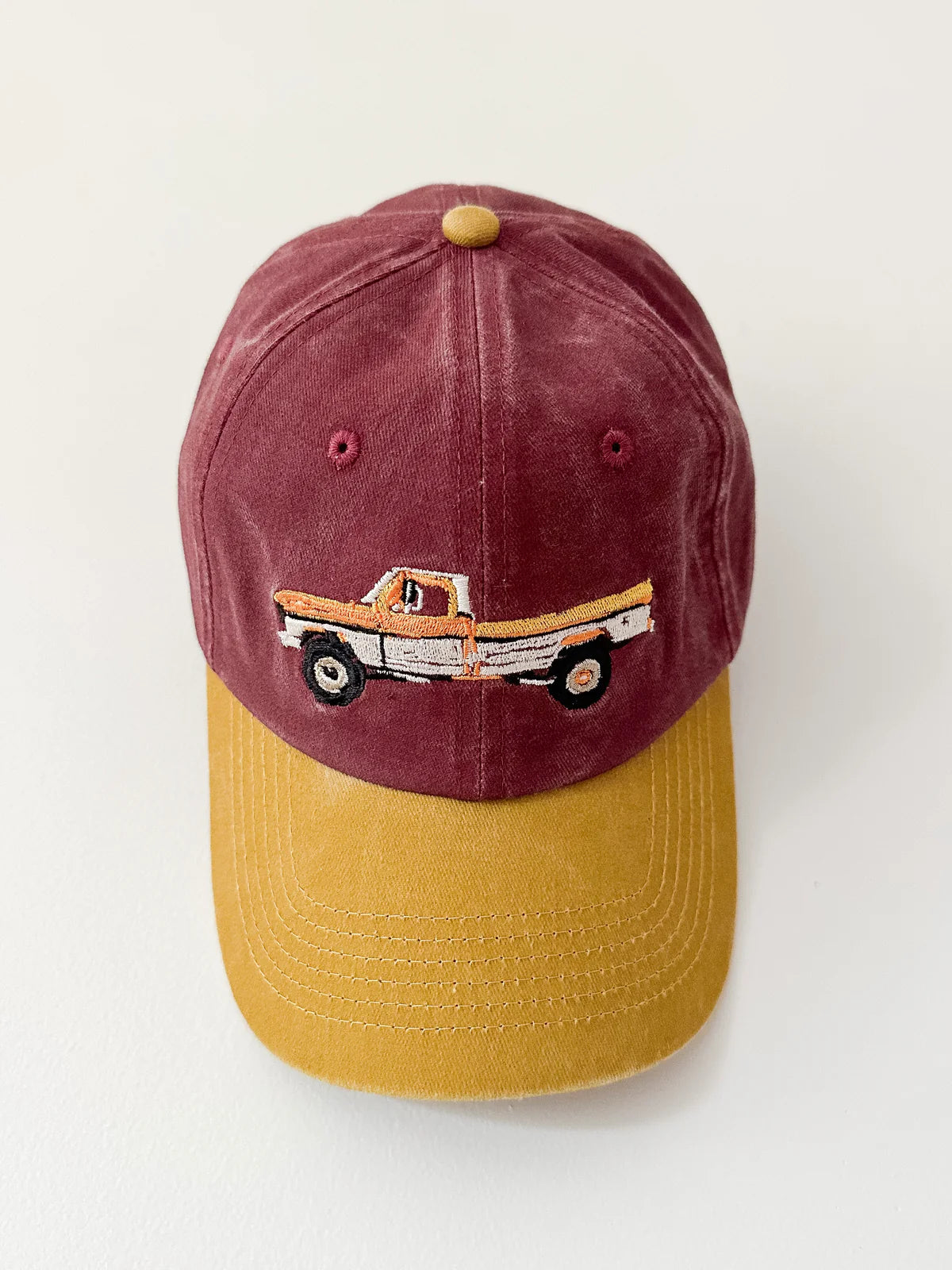 Hand painted truck design embroidered on vintage wash crimson cap with adjustable brass look strap, featuring contrast mustard wash brim.