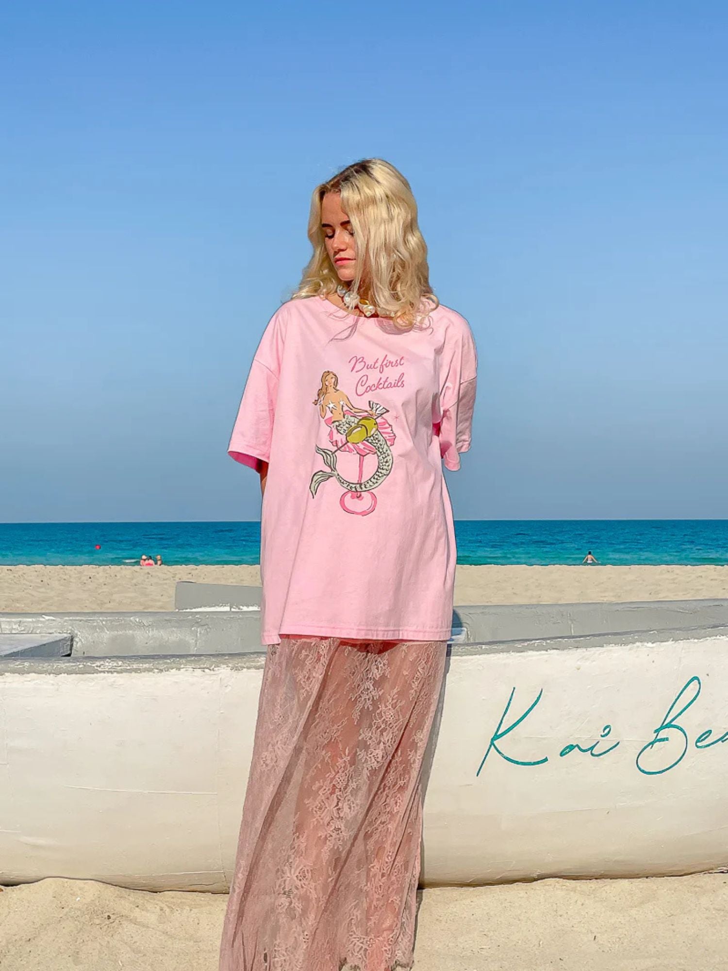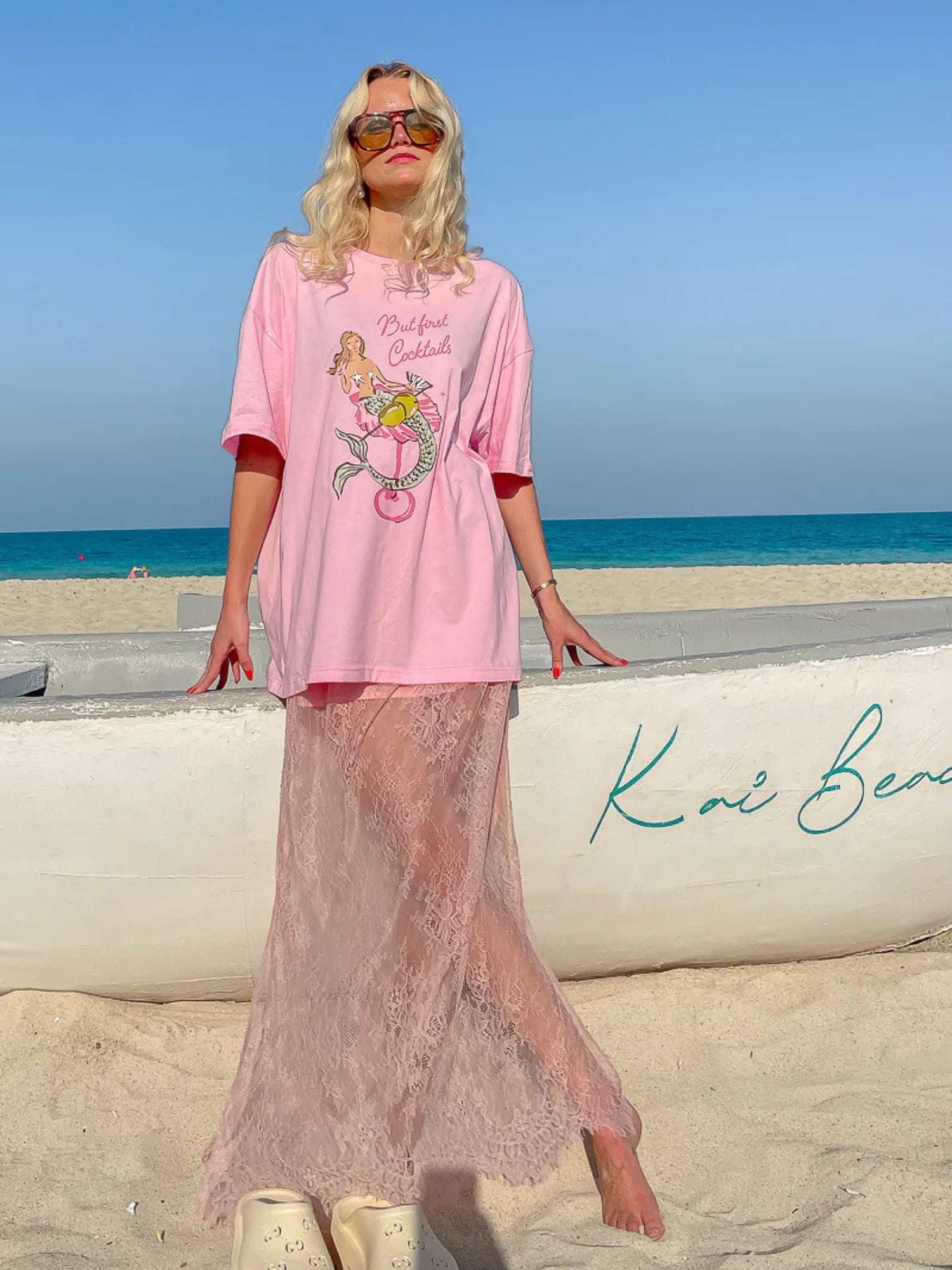 Introducing the Daintree Lace Skirt in a dusty pink colourway. Featuring a stunning intricate lace design with a border detail and side splits. An elastic waistband offers a comfortable fit, and rayon lining to mid thigh makes for more wearability. Pair with our oversized t-shirt designs- Soleil Tee or Mermaid Cocktail Tee.