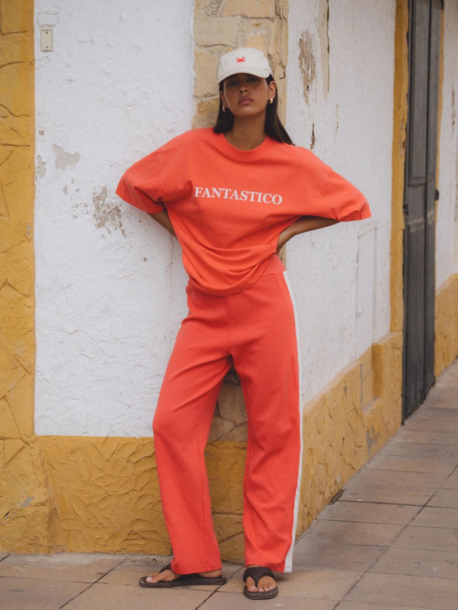 Introducing our new Fantastico Tee in Lobster Red. Cut in our classic oversized, boxy fit with "Fantastico" at the front in velvet for that European touch. This classic crew neck shape is the perfect holiday tee and pairs perfectly with our Seaside Terry Short in Lobster Red.