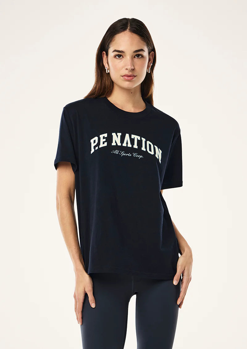 The Heritage Tee in Dark Sapphire is crafted in our new midweight ,100% organic cotton jersey fabrication. This relaxed fit crew neck tee features a P.E Nation seasonal logo at the center front. Wear yours with active leggings for an easy athleisure look.