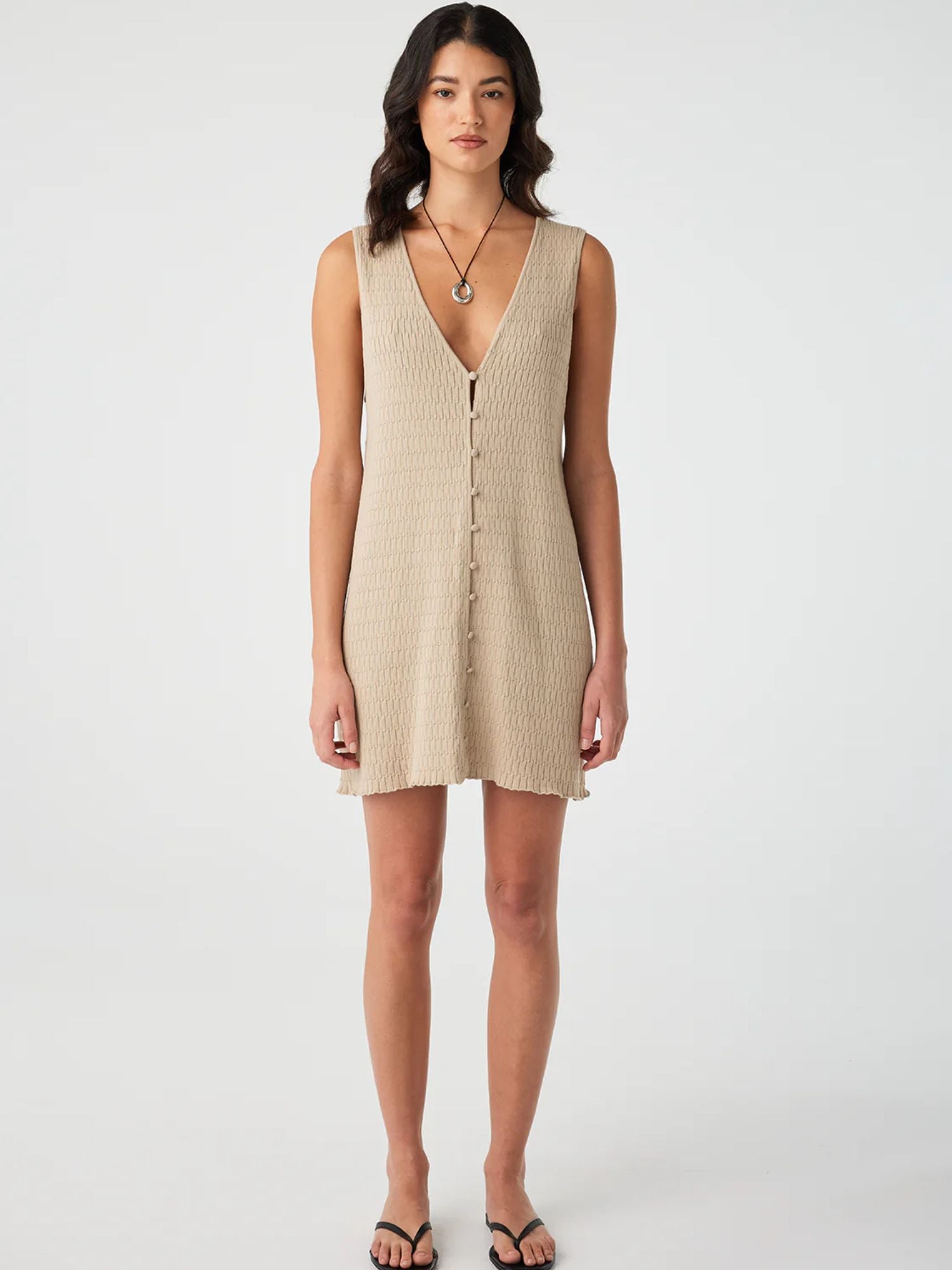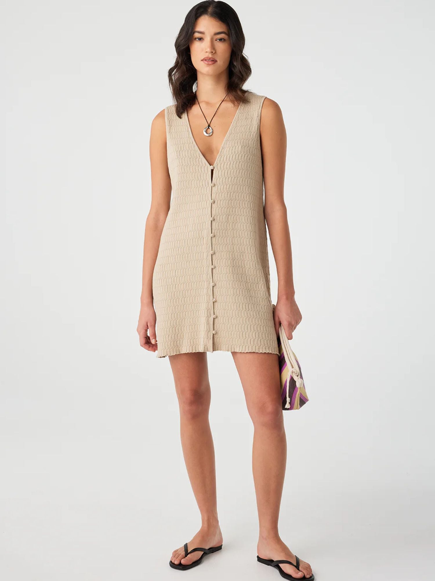The Jude Reversible Mini Dress in Taupe redefines versatility with its modern A-line silhouette and textured knit. Featuring a deep V-neck and button-down front, this reversible design offers two distinct styling options. Perfect for layering or wearing on its own, it’s a statement piece crafted for comfort and sustainability.