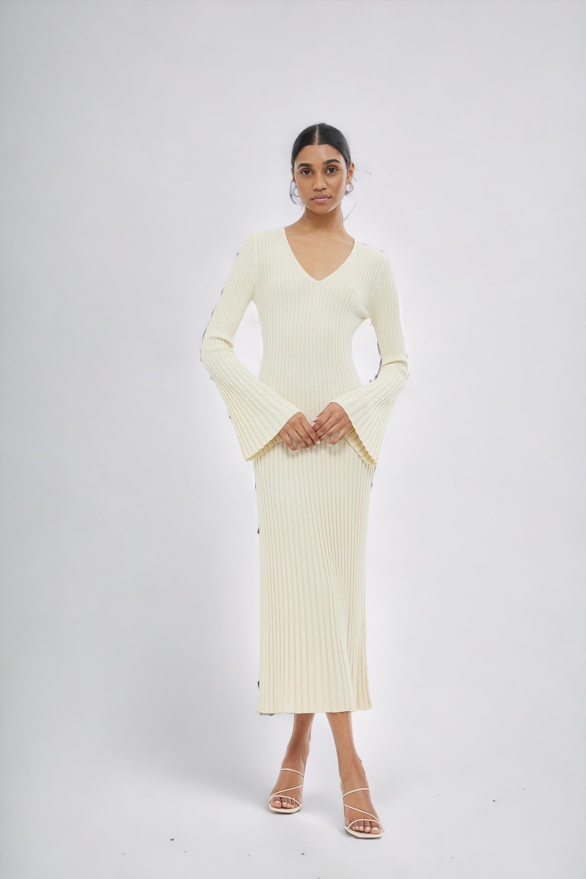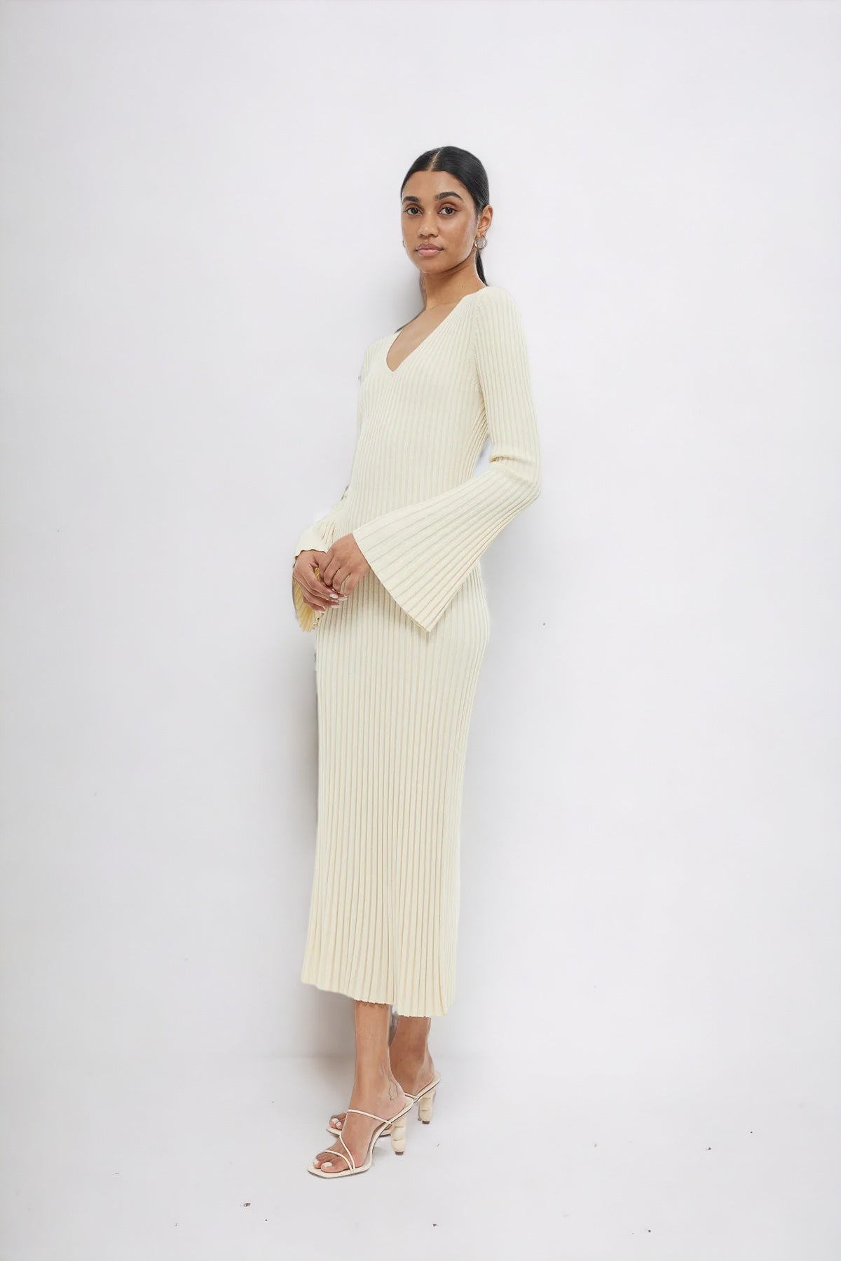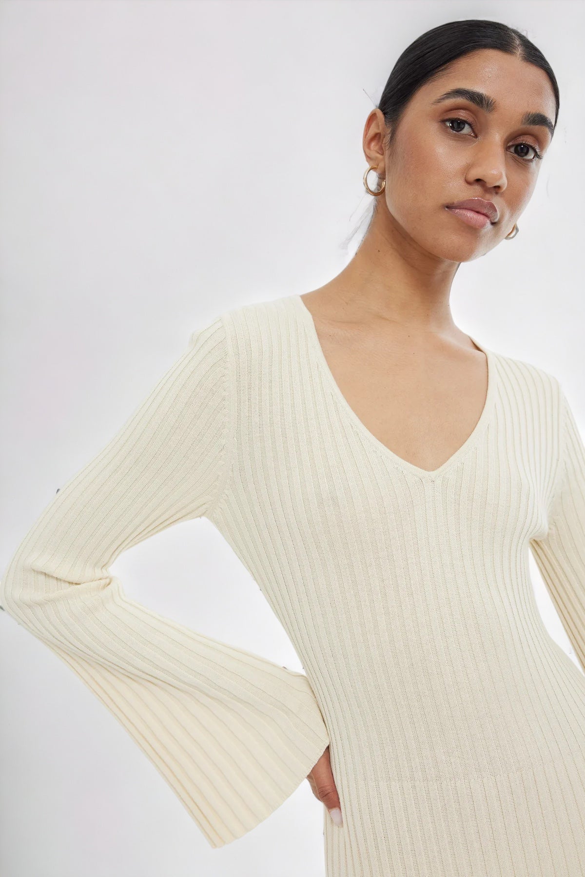 The Lani Knit Dress in Cream boasts a feminine and flattering silhouette, crafted from a luxe blended viscose and cotton fabrication. Designed for a slim fit, the dress features a v neckline, flared sleeves and a mid-weight ribbed knit texture. Soft to the touch, the Lani Knit Dress falls to a midi length and boasts versatile wear. Pair back with flats for everyday outfitting or statement heels for occasion dressing.