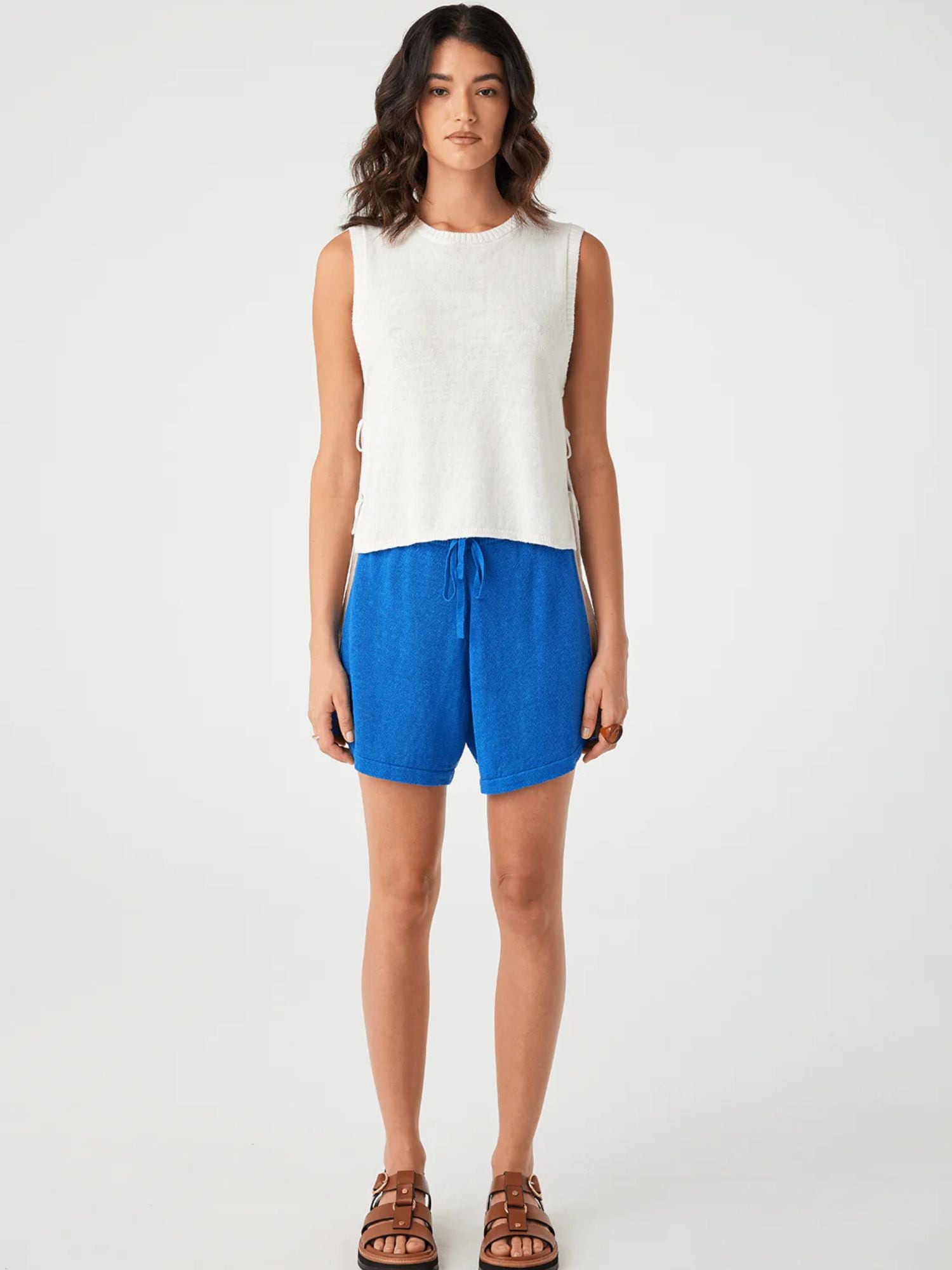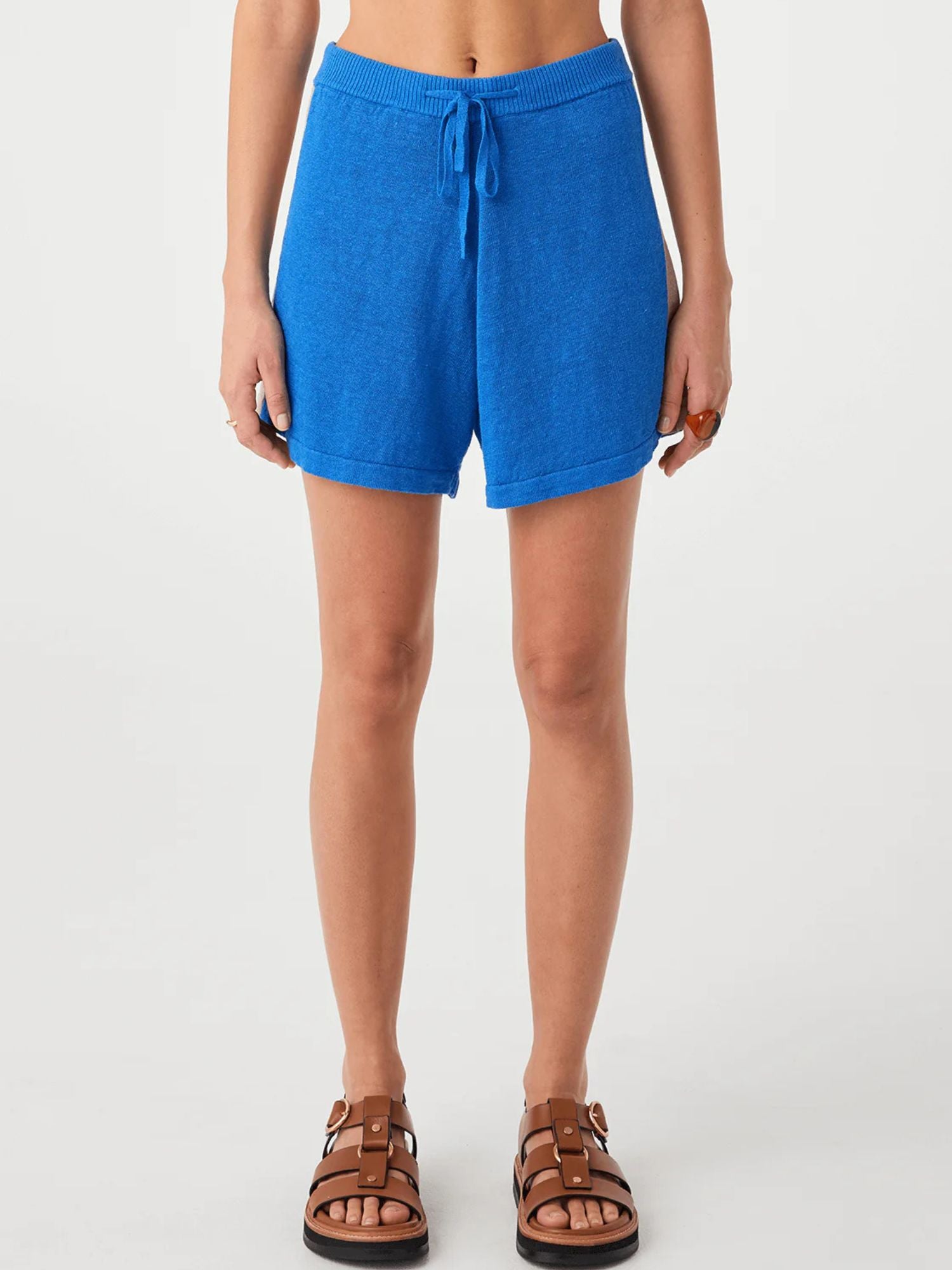 The Larri Linen Knit Short in French Blue blends a relaxed design with breathable comfort. A sporty fit, elastic waist, and contrasting side stripe make it an easy favourite.