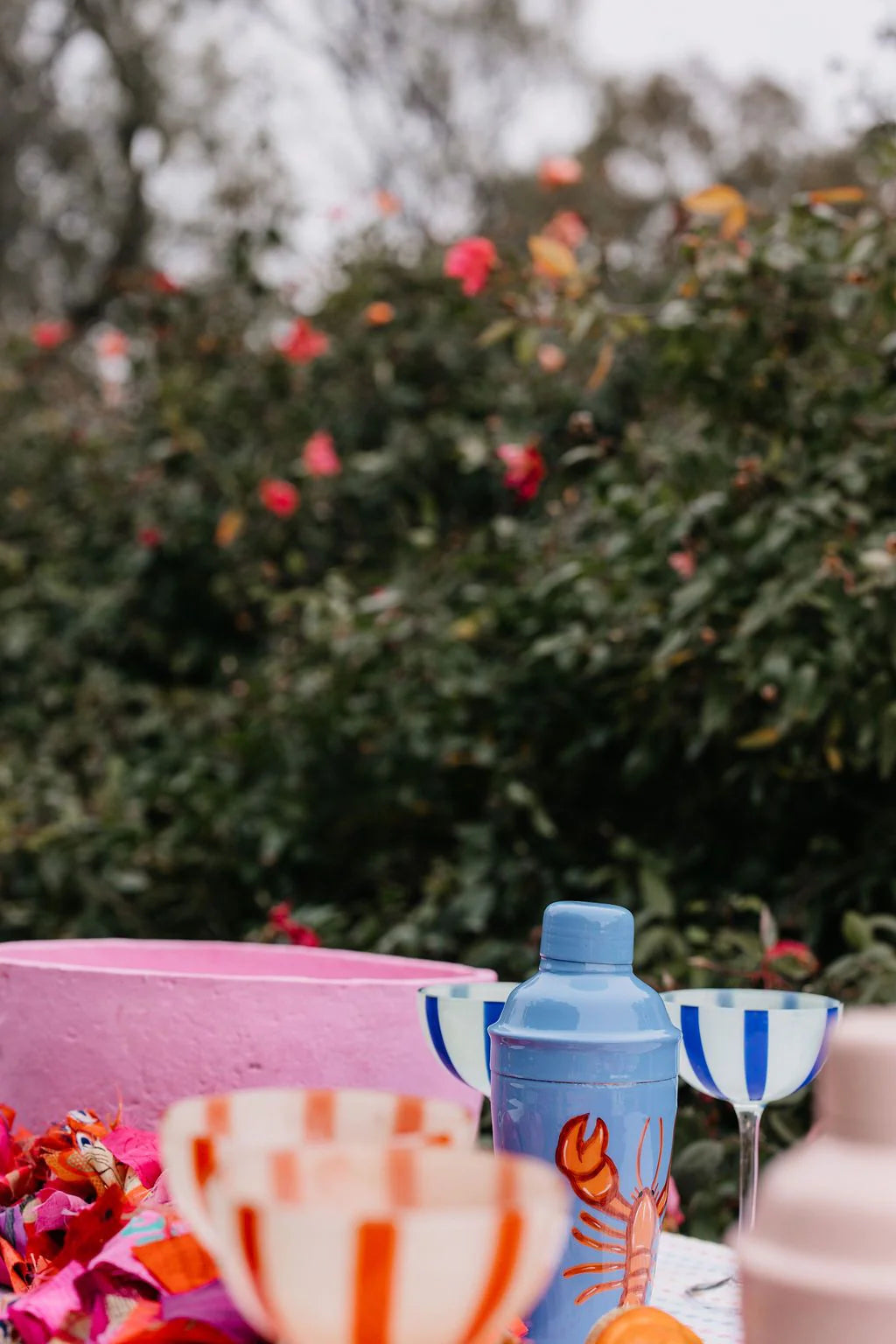Add a splash of seaside fun to your home bar with this Lobster Cocktail Shaker. Featuring a hand-painted lobster design in vibrant red and orange against a light blue background, this metal shaker comes with a handy shot measure lid for perfect pours every time. Just handwash to keep its colorful charm shining bright. Cheers to mixing drinks with a playful twist!