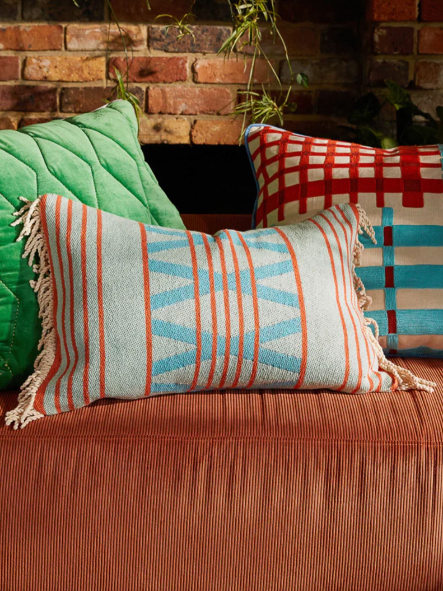 “Our Los Altos Cushion takes a different approach to geometry, leaning into retro-inspired motifs with a global feel. The combination of stripes and diamonds creates a layered feel across its softly textured, woven surface, elevated by rich and earthy hues. It’s finished with corded fringe at two of its sides for an added touch of playfulness.” – Phoebe’s Style Notes