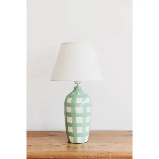 Green Gingham ceramic lamp base with linen taper lamp shade