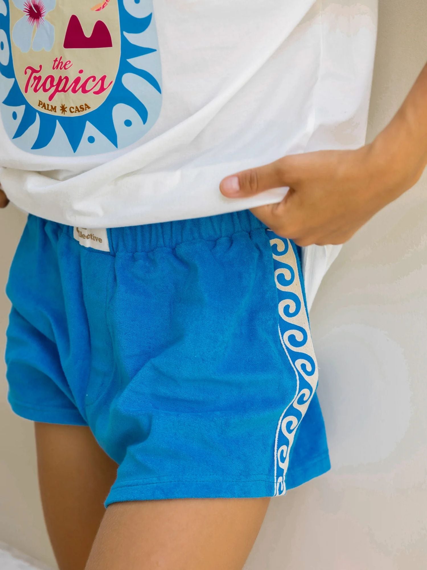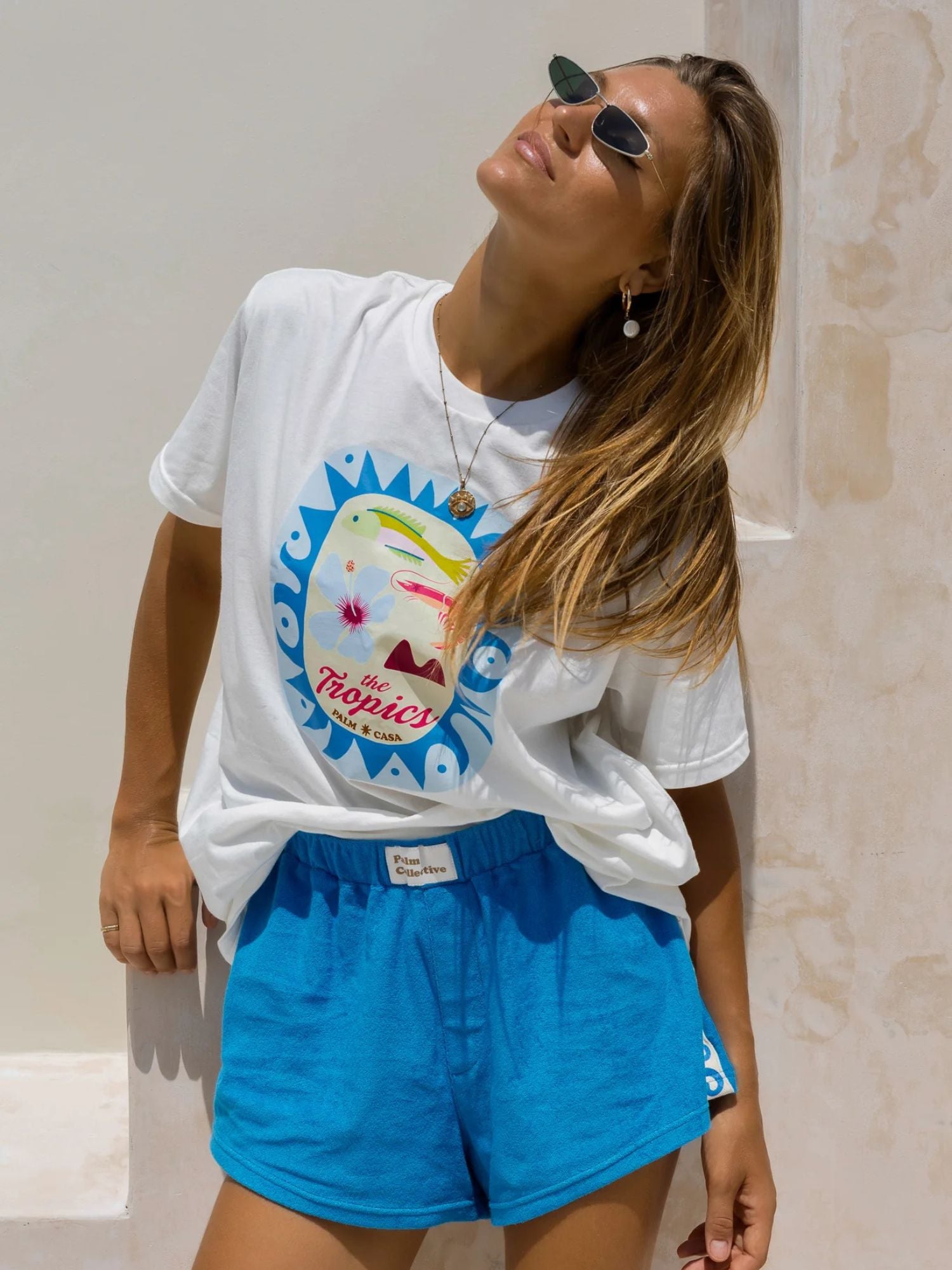 Our new Terry shorts in blue are made from terry towelling fabric in a low waist style that features an elastic waistband with logo, and fake fly. The shorts are a relaxed style, with a wave cotton trim on the sides. Style it with our matching Marlin Fish T-shirt to create the perfect comfy set. Exclusively by Palm Collective.
