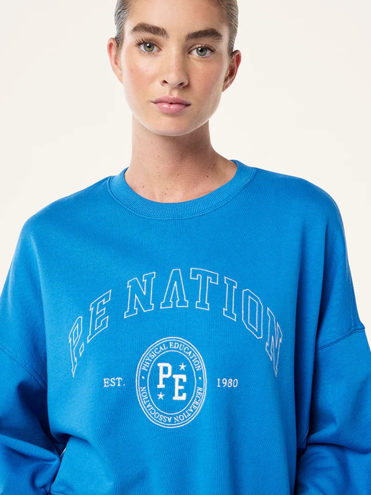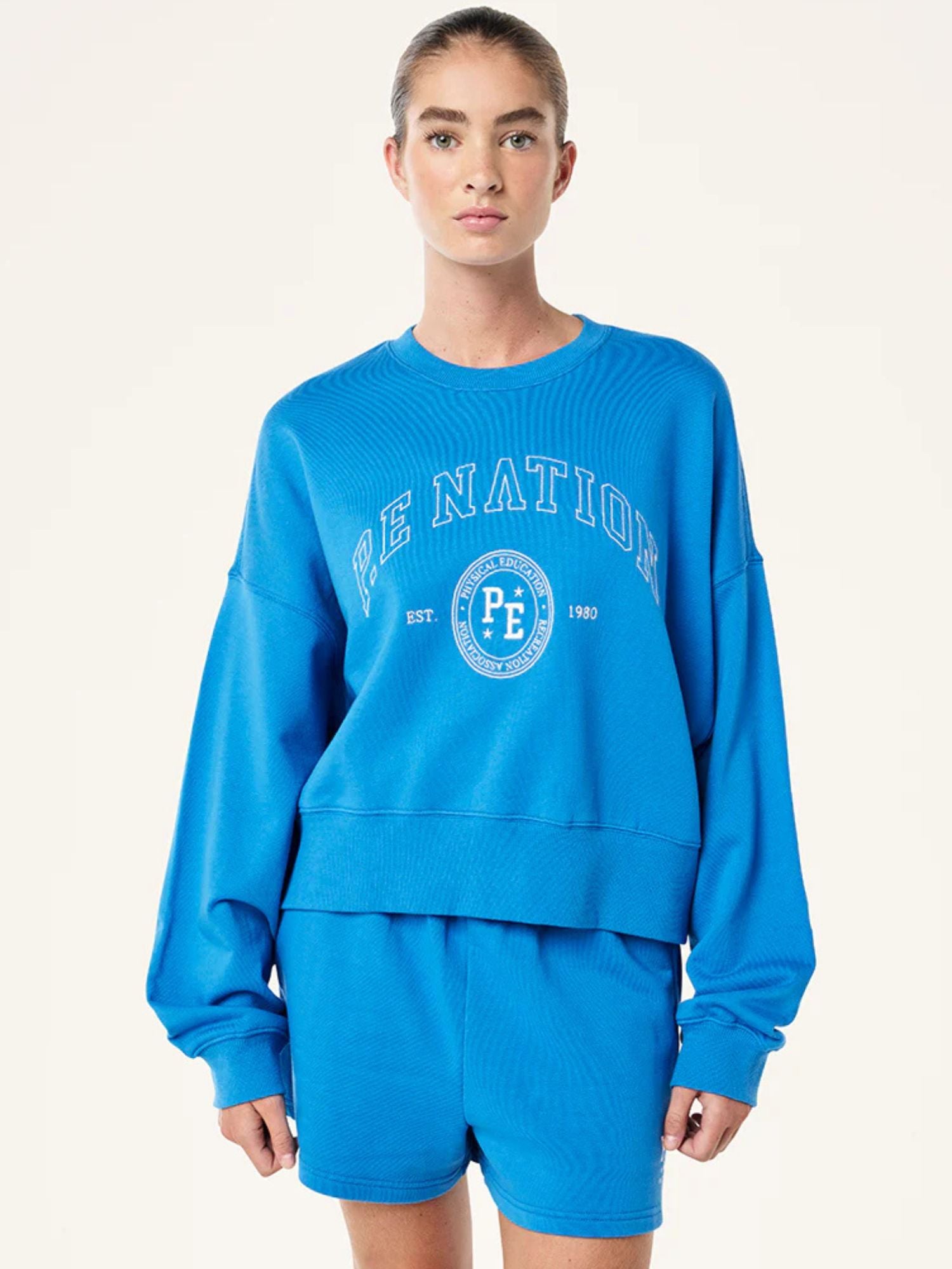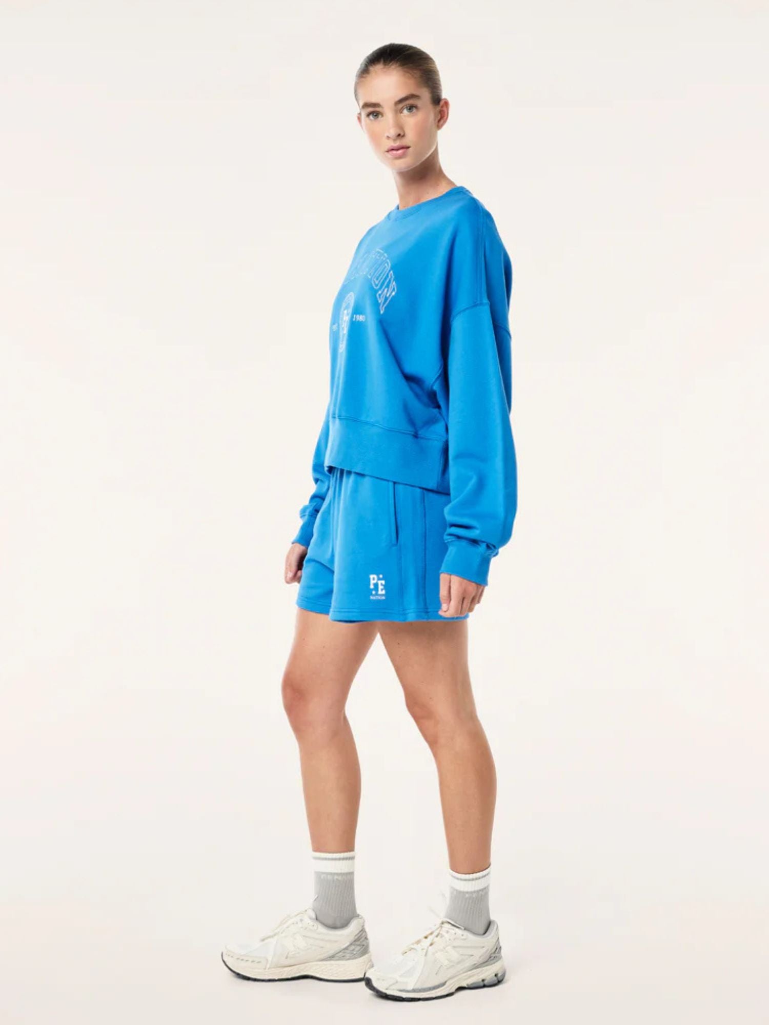 The Adobe Sweat in French Blue comes as part of our FUTURE MODERN Collection. Crafted from a soft, brushed cotton blend, this relaxed fit sweat is a P.E Nation must have. Featuring a Seasonal graphic at centre front, it’s perfect for lounging, or wearing the matching Adobe Short to match the set.