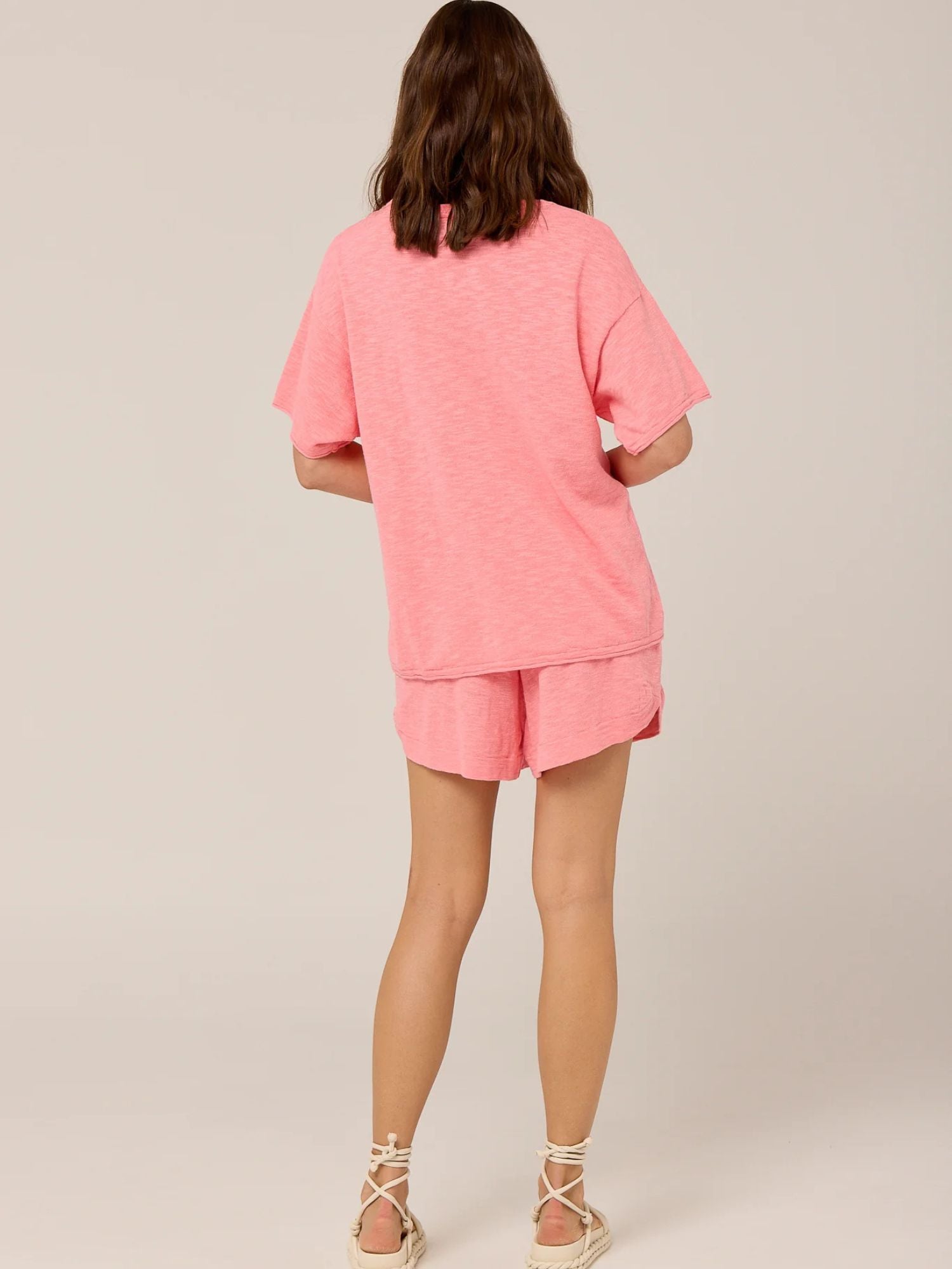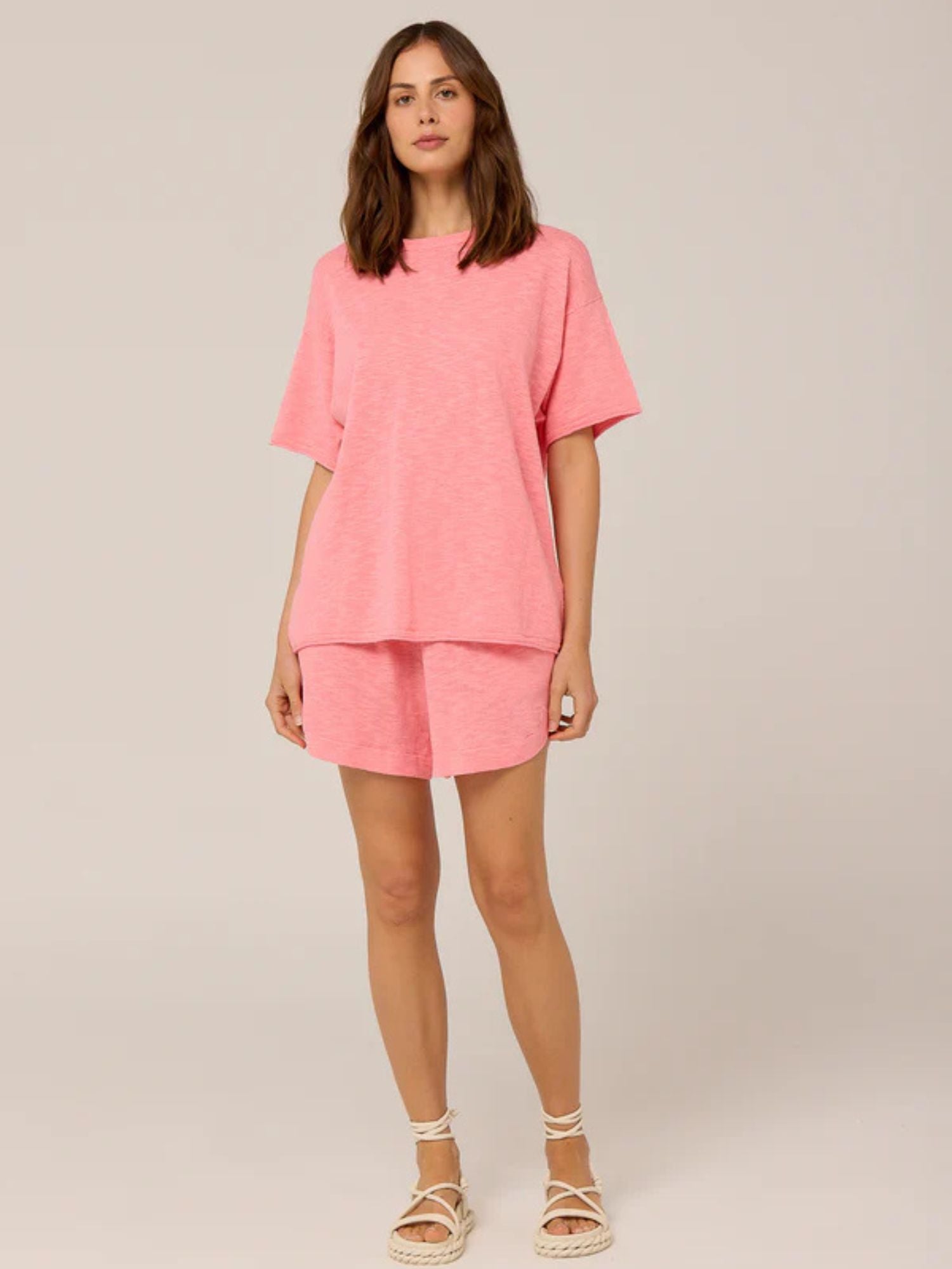 Linen jersey perfection. Crafted from 75% Cotton, 25% Linen, the Braelyn Short is the ultimate lightweight lounge short. Featuring an elasticated high waist, side scooped hem and in seam pockets. Pair with the Sevilla Tee for the perfect luxe lounge look.