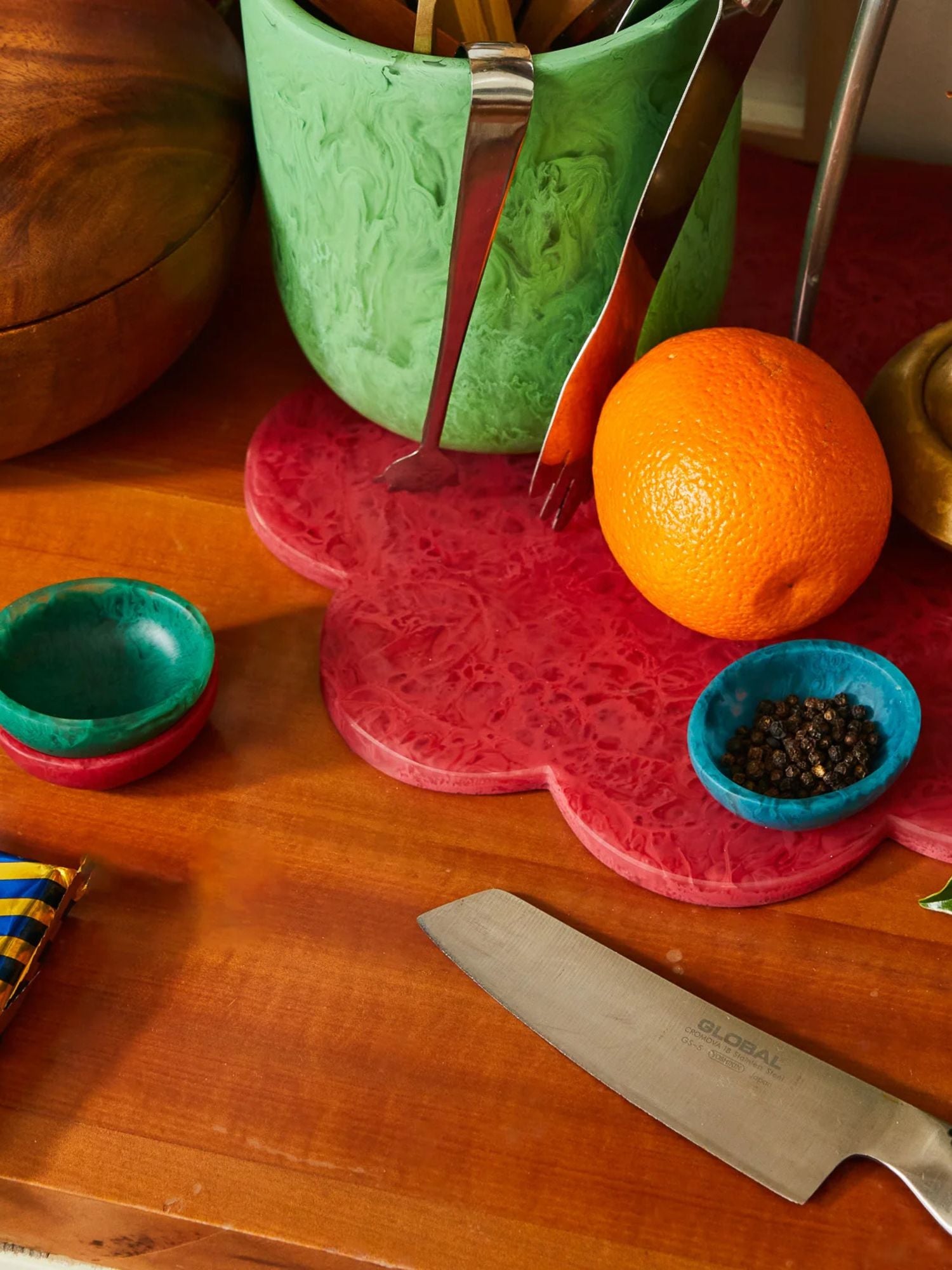“Whether you’re entertaining or just enjoying daily dinners with the family, our resin tableware makes every meal an experience to remember. The Candice Board features scalloped edges to create a beautiful flower shape, bringing plenty of character and elegance to celebrations of all kinds. Our stunning Mandarin colourway – swirling together juicy orange hues and transparent resin for a zesty finish.” – Phoebe’s Style Notes