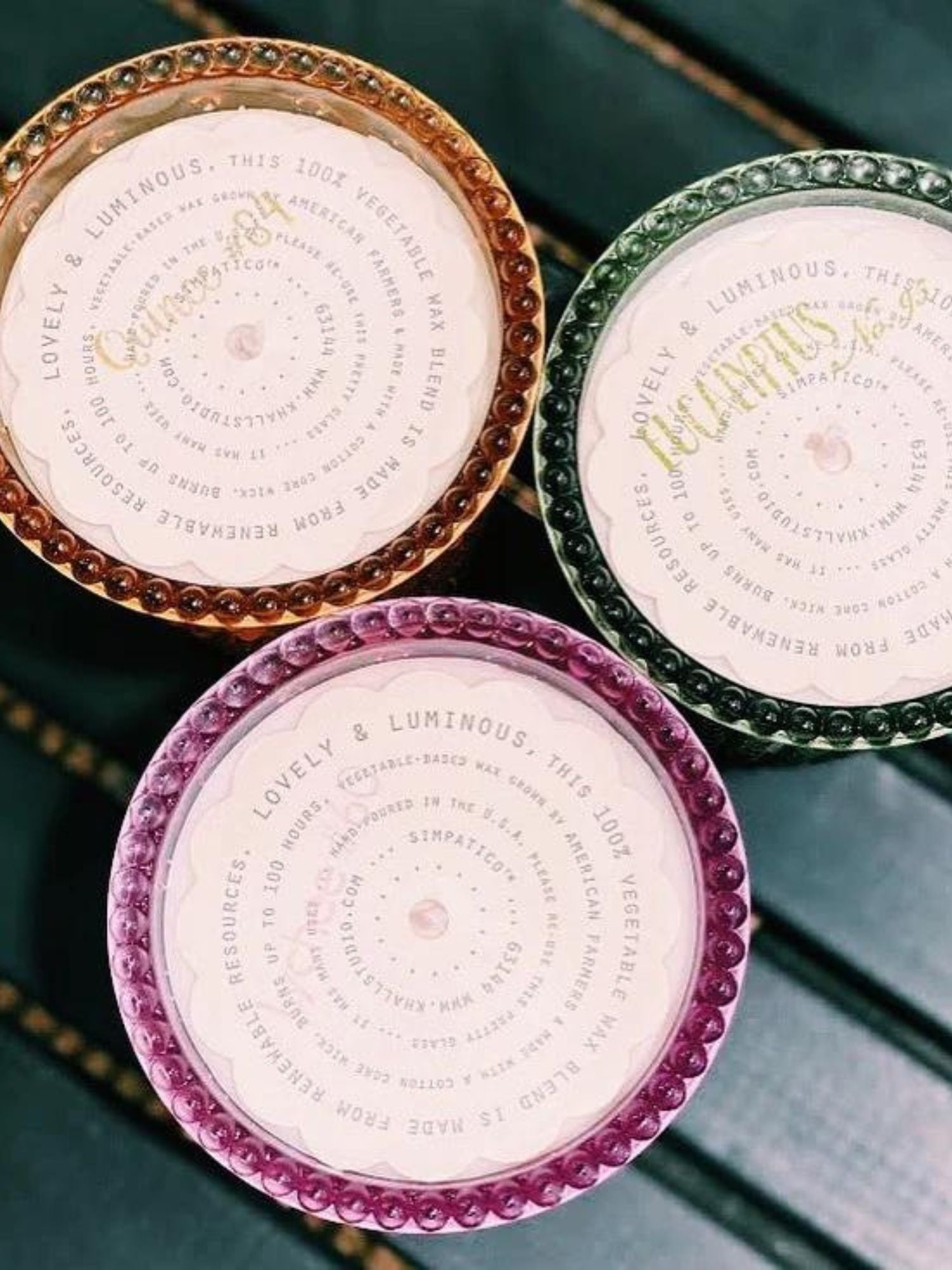 Simpatico's Lychee Hobnail Candle offers up notes of juicy berries and sweet lychee grounded with violet musk. Presented in Simpatico's signature hobnail glass jar which can be repurposed as a vase or accent piece after the candle has finished burning.. 1