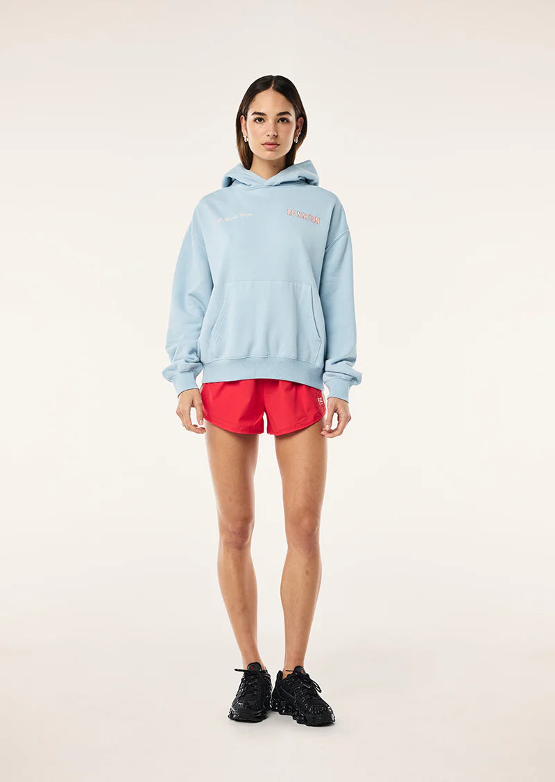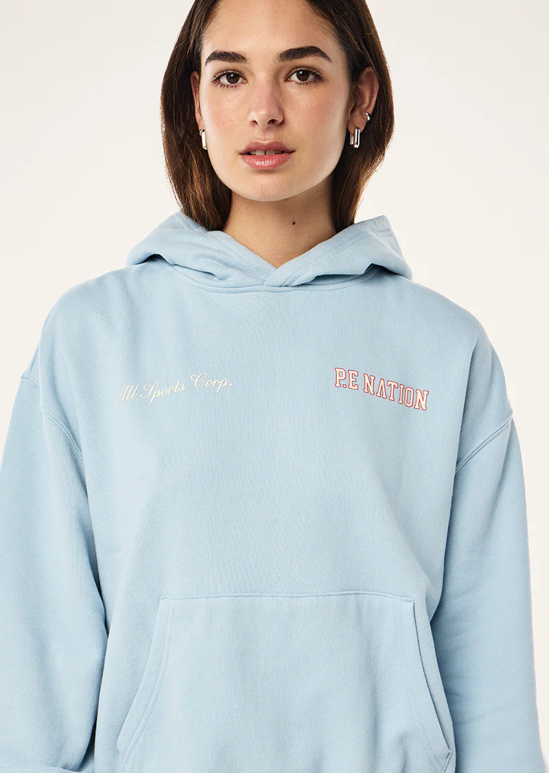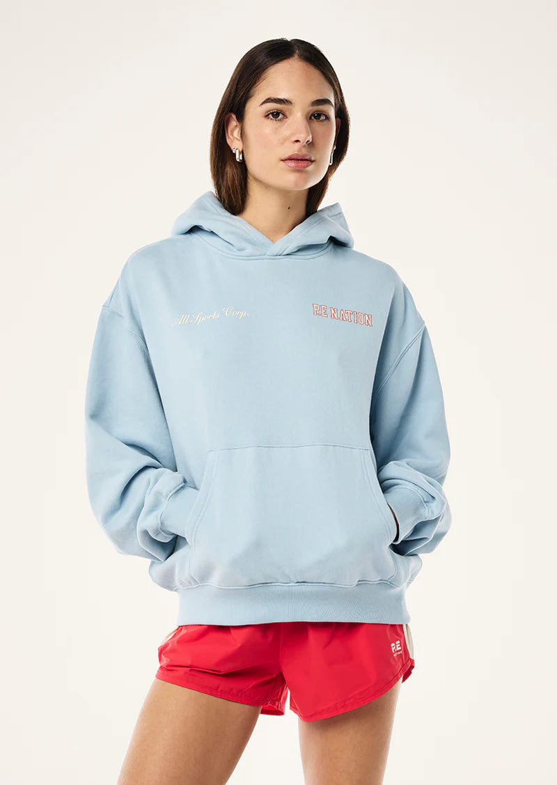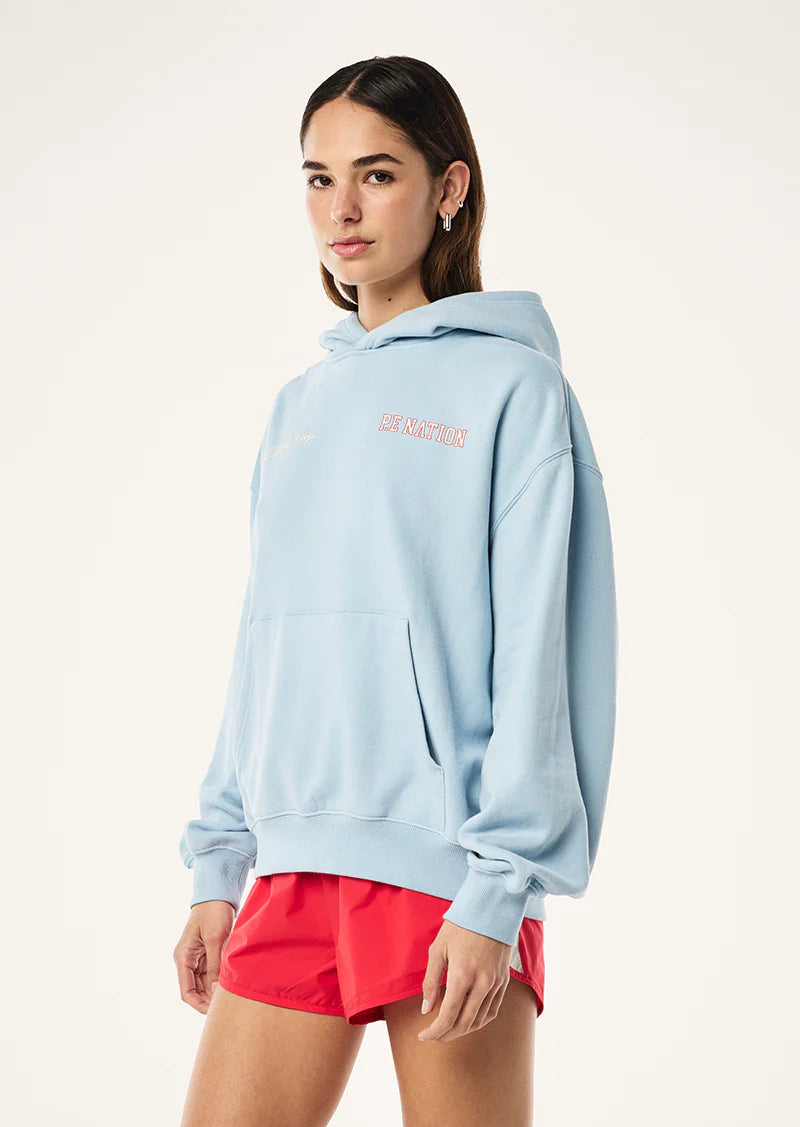The Surge Hoodie in Ice Blue is made from an ultra luxe peached-brushed fabrication. This oversized fit hoodie features a self-lined hood, kangaroo pocket, ribbed hem and cuffs, and a centre front P.E Nation logo. Ideal for lounging, style this hoodie with your favourite legging or short for all day comfort