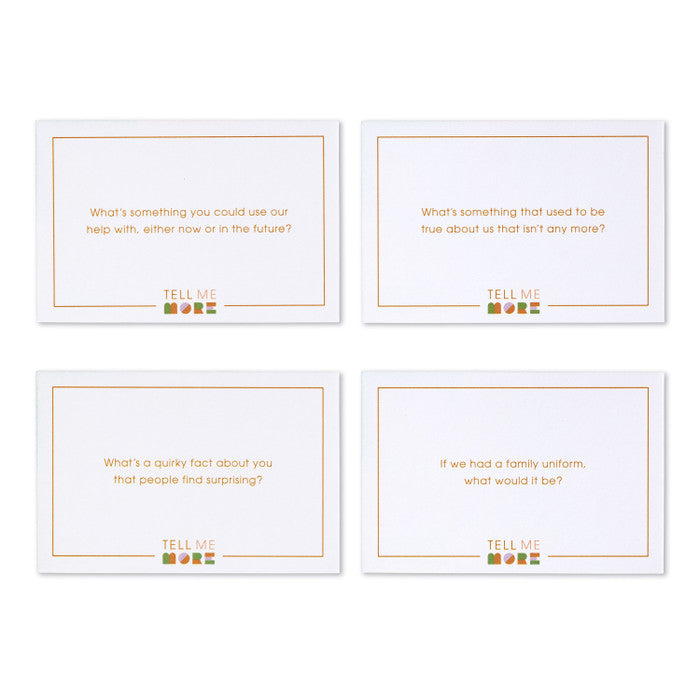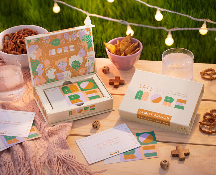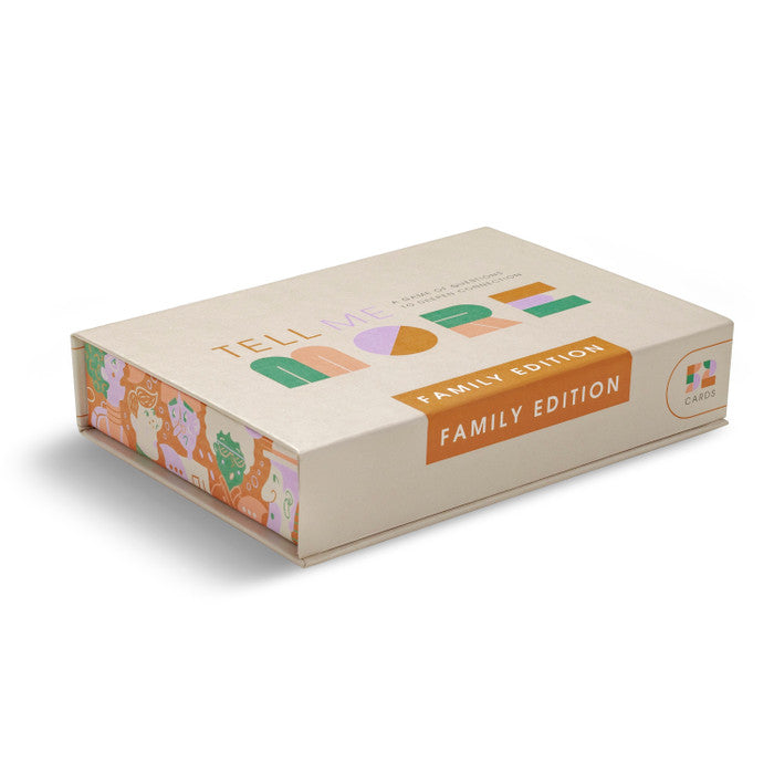 Ask the thoughtful questions one-on-one with a parent, a grandparent, a child, a sibling, a cousin. Or play as a family game (instructions included!) during dinners, gatherings, road trips, or anytime.