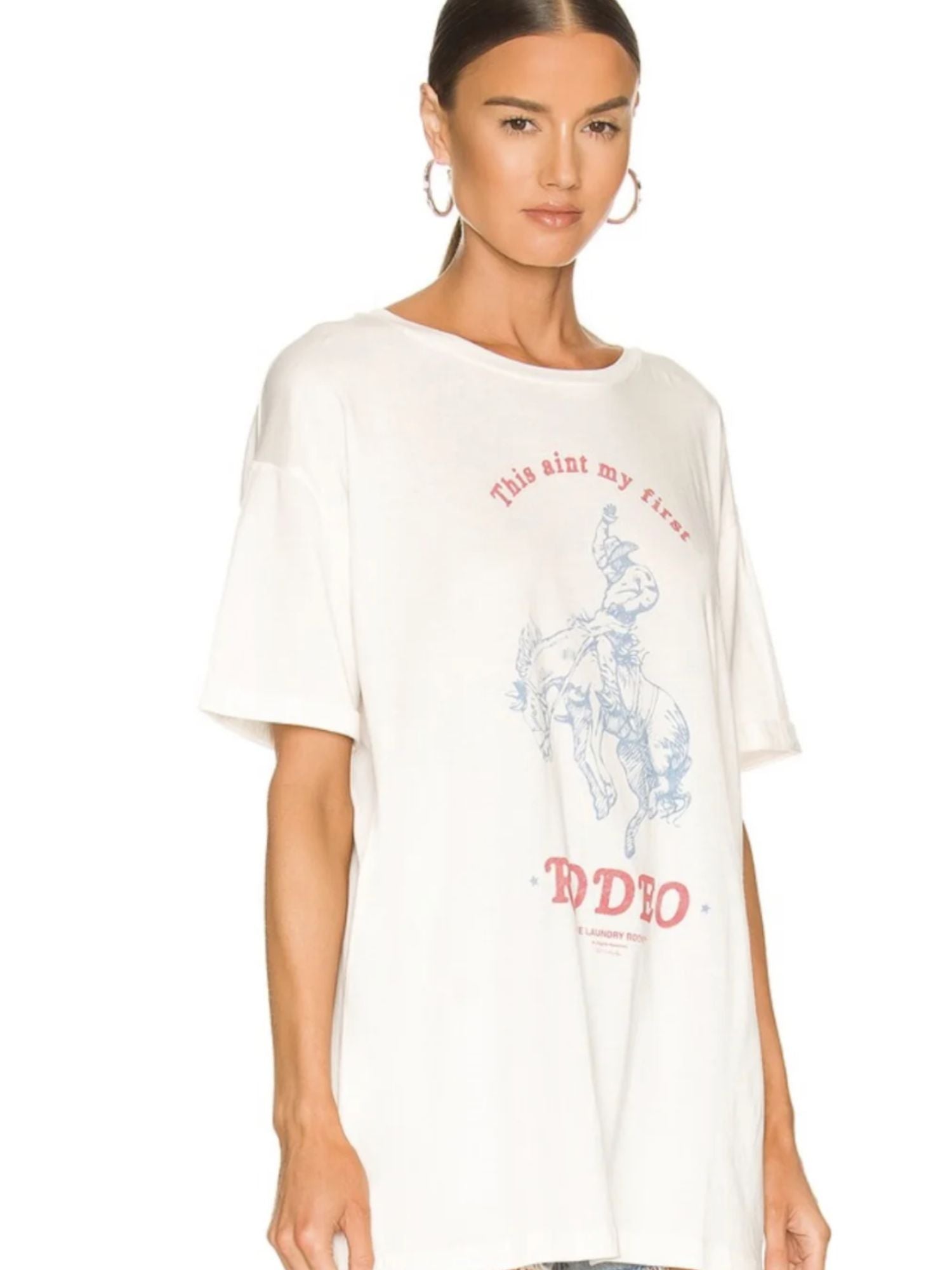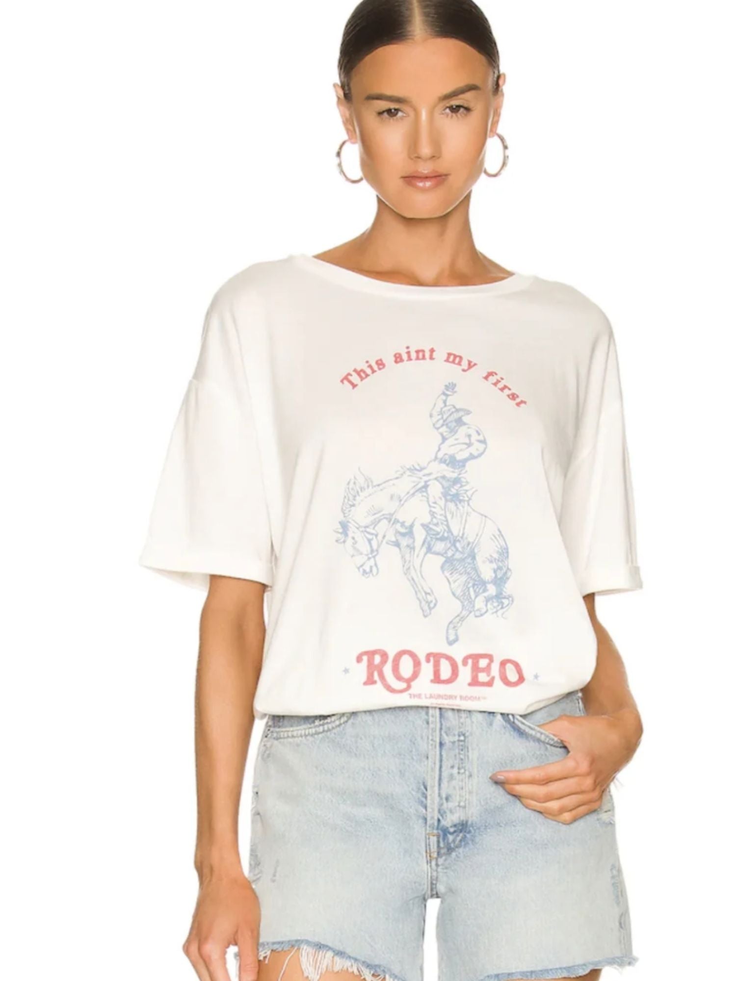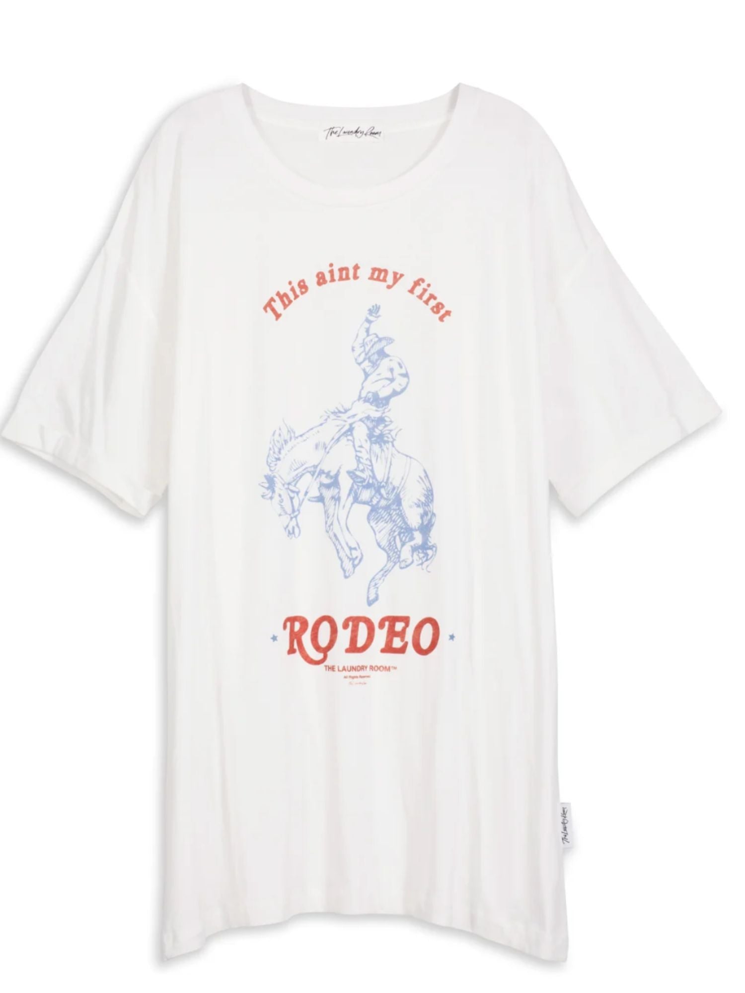 A playful and nostalgic graphic print showcasing "First Rodeo" as part of a collection inspired by Americana. The fabric feels luxuriously soft and smooth against the skin, offering a breathable, lightweight comfort due to its unique blend of 50% cotton and 50% modal butter jersey knit.