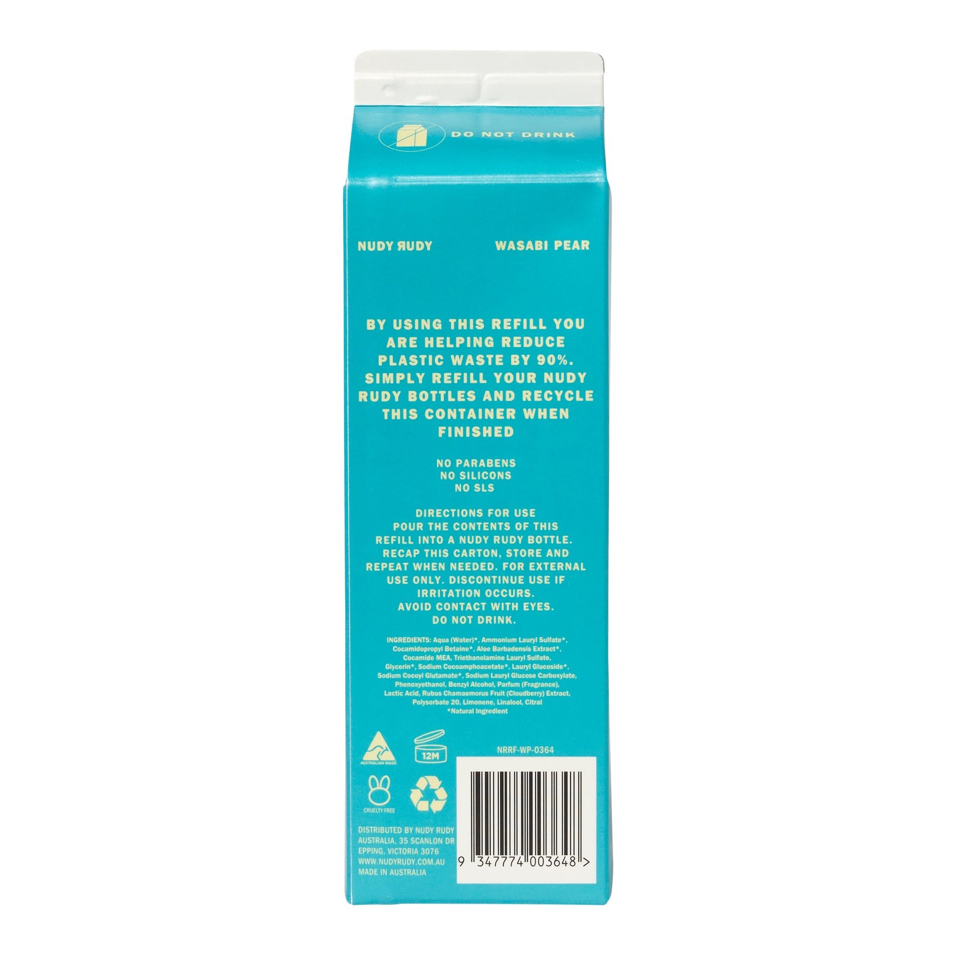 One carton of Nudy Rudy Hand & Body Wash Refill equals 2 x 500ml plastic bottles, reducing waste by 90%.